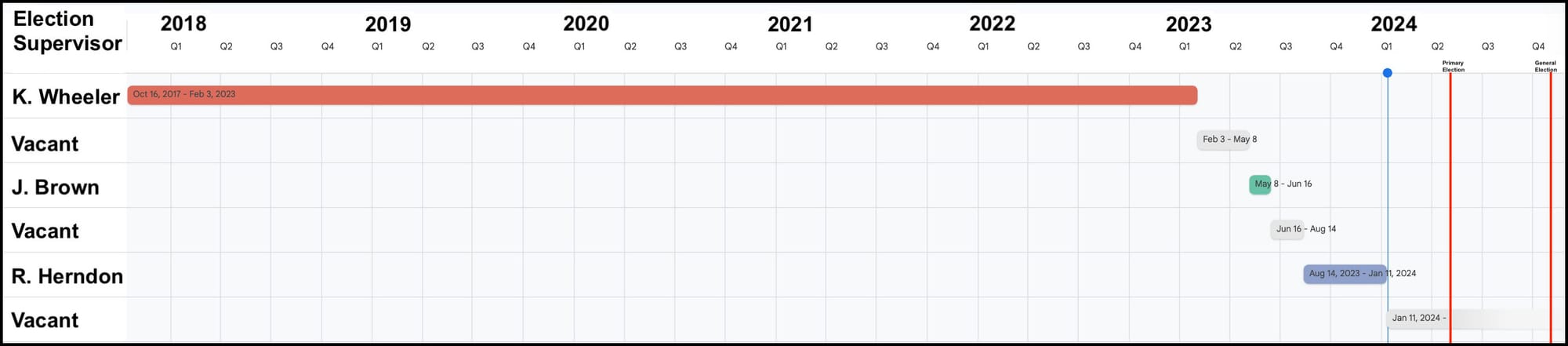 Elizabeth Sensenstein, who is Monroe County’s human resources administrator, responded to a B Square request for information about the recent history of the election supervisor’s position by listing two more employees after Wheeler: Herndon, who served from Aug. 14, 2023 through Jan. 11, 2024; and before that Jessica Brown, who served five weeks, from May 8 to June 16, 2023.