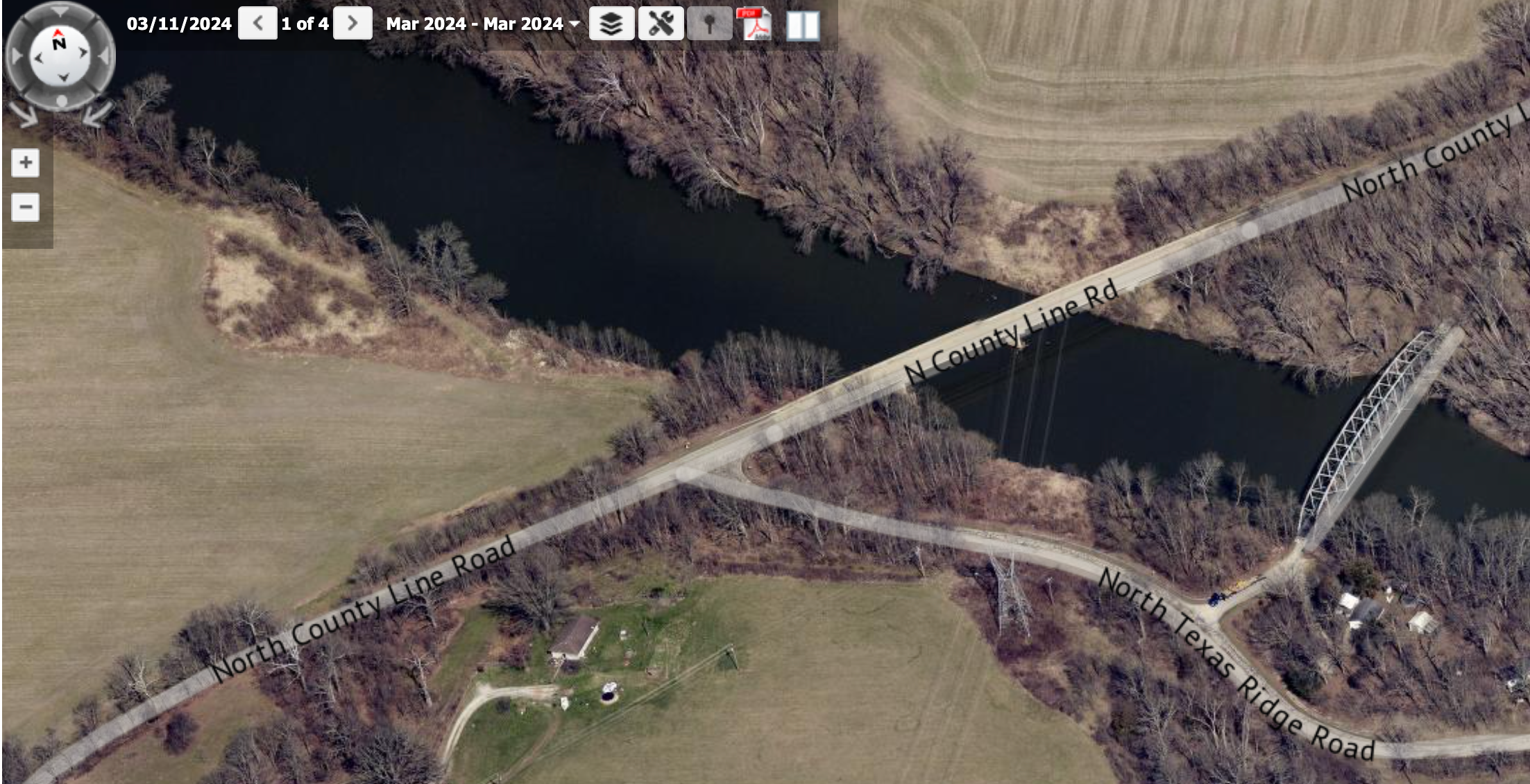 Both images are from the Eagleview module of Beacon, the geographic and information system used by Monroe County for parcel lookup. Left: The location bridge to be repaired is the modern one, not the historic one in the right of the frame. Right: The orientation of the image is looking south at the parking lot for the North Showers building.