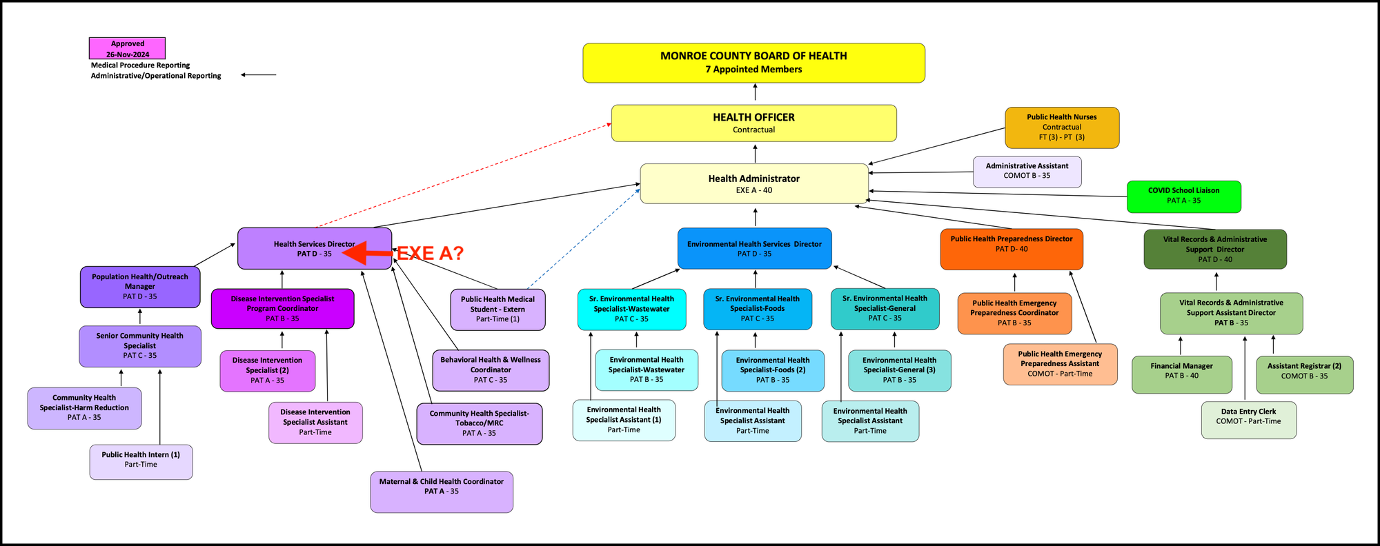 On Tuesday night, a request from Monroe County's health administrator Lori Kelley to change the job classification of the department's health services director from a lower classification (PAT D) to a higher one (EXE A) failed on a 2–5 vote.
