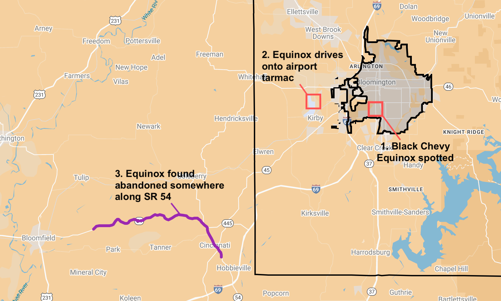 Deputies ended up locating the stolen Equinox with no one inside, behind a residence on East State Road 54 in Greene County. A Bloomington police dog was used to try to track the suspect, without success. Bloomington police took the Equinox as a part of their stolen vehicle investigation from the day before, according to the release.