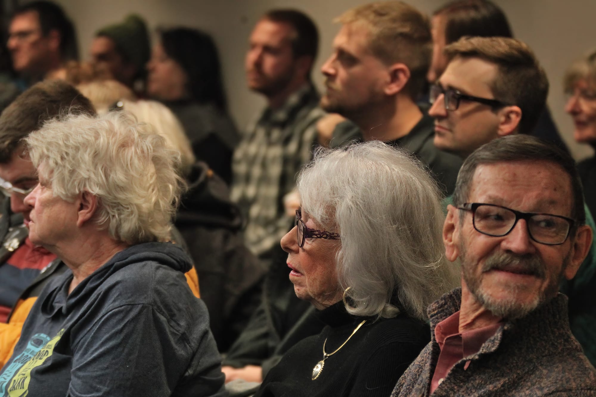 At the Democratic Party’s caucus, all the votes, by more than 80 precinct chairs and vice chairs who packed the city council chambers, were taken by unanimous acclamation.