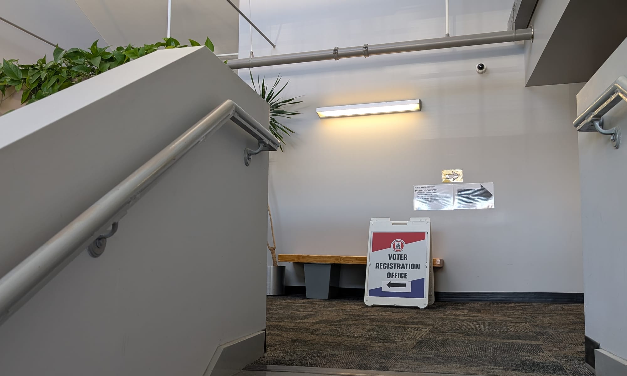 The signs on the second floor of the North Showers building point the way to the new, temporary location of the voter registration offices.