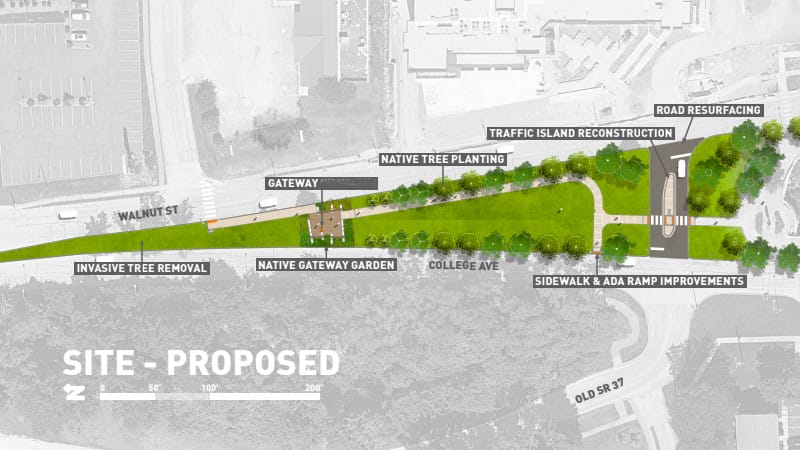 The planned location is on the narrow part of the median, where College Avenue and Walnut Street squeeze together as the roadways approach the SR 45/46 bypass.