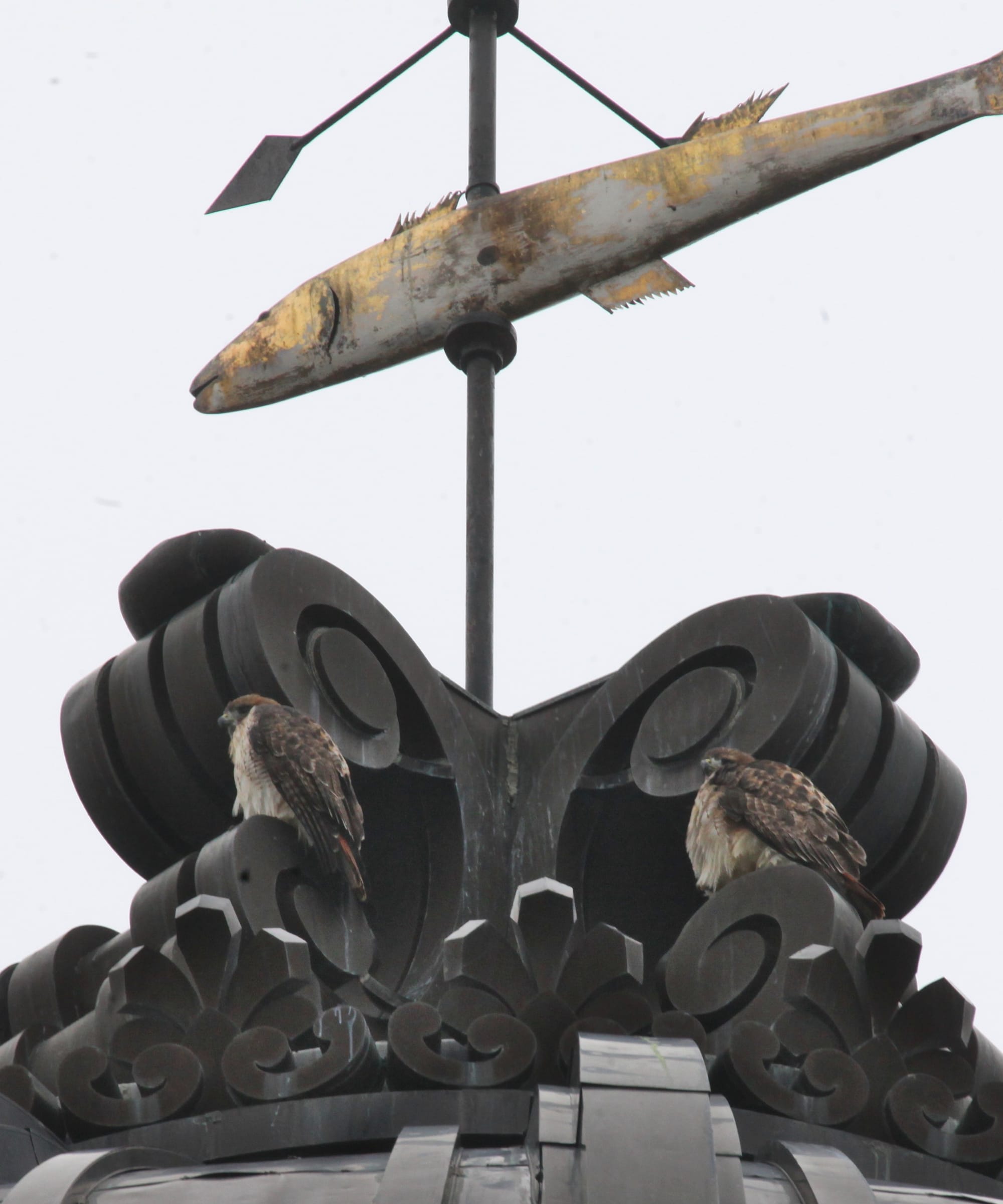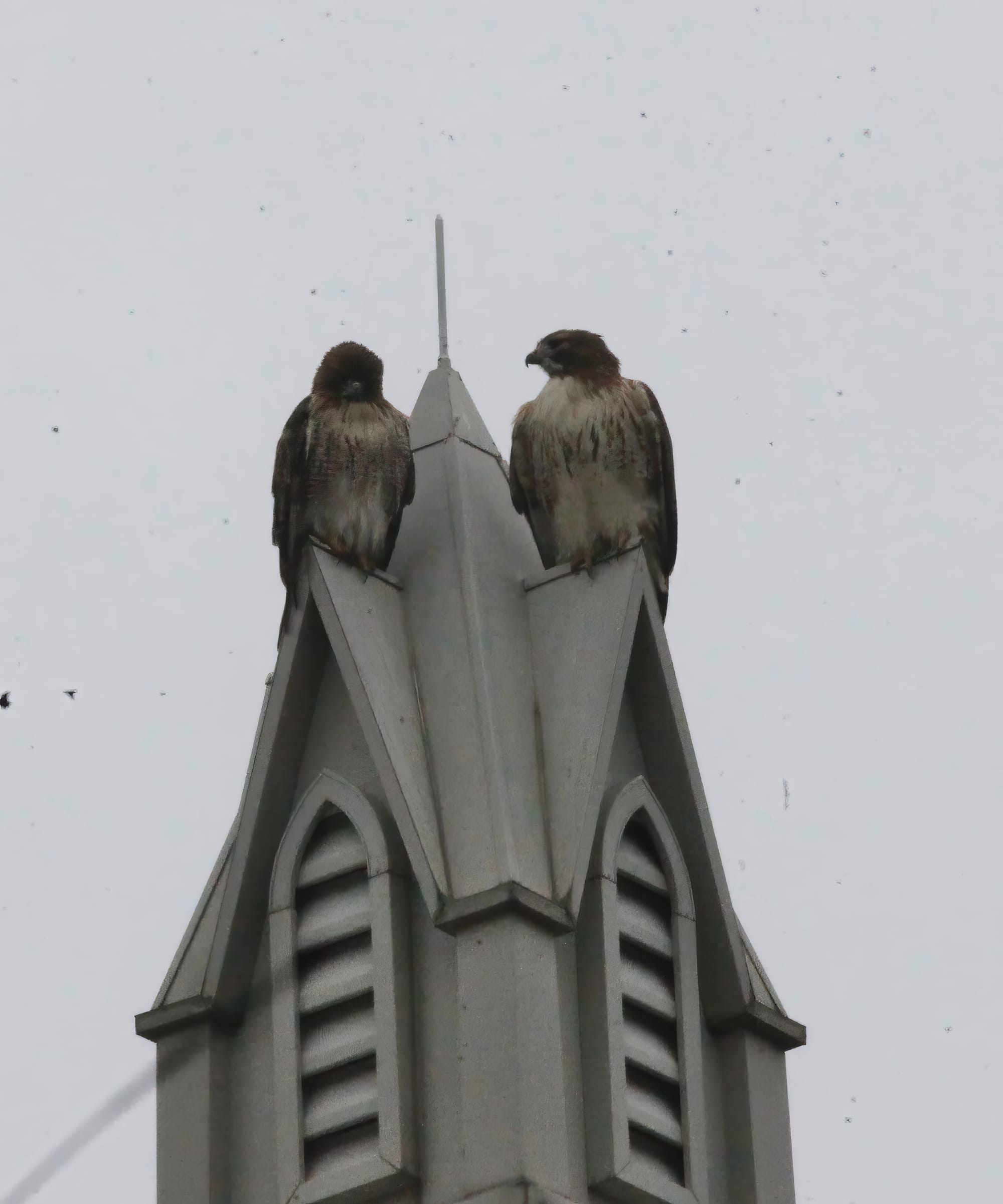 A pair of red-tailed hawks are perched on the steeple of First Presbyterian at Lincoln and 6th streets. They fly off to the west one block and take up a post on the Monroe County courthouse dome. (Dave Askins, Nov. 19, 2025)