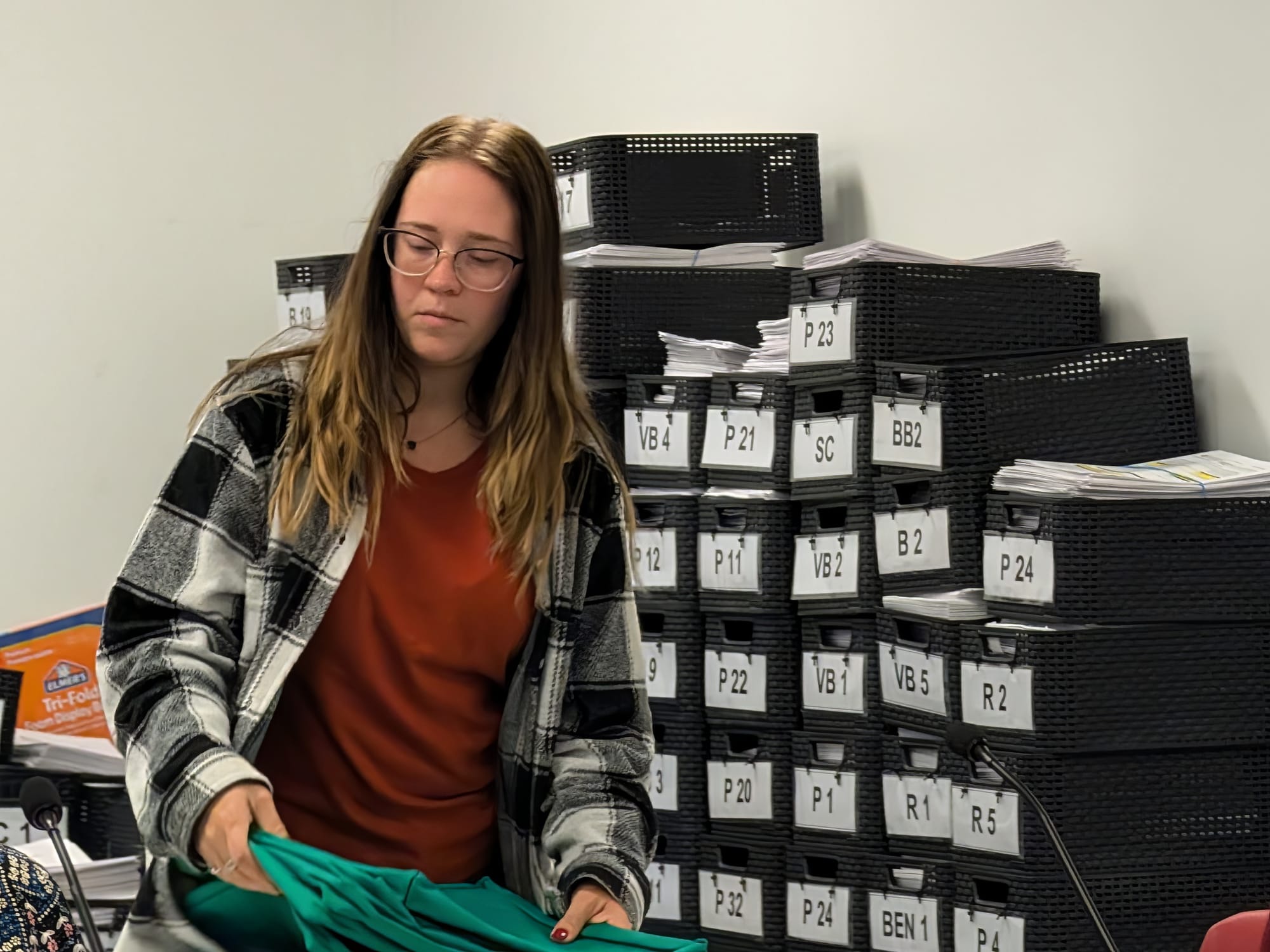 Working at a table in the Election Central building at 7th and Madison streets were election board members Judith Benckart, the Republican Party appointee, John Fernandez, the Democratic Party appointee, and Nicole Browne, who is the elected county clerk. Also at the table were the county election supervisor Kylie Farris, and election training specialist Ashley Lirot.