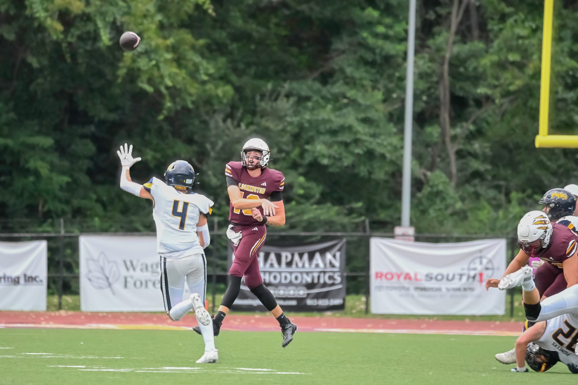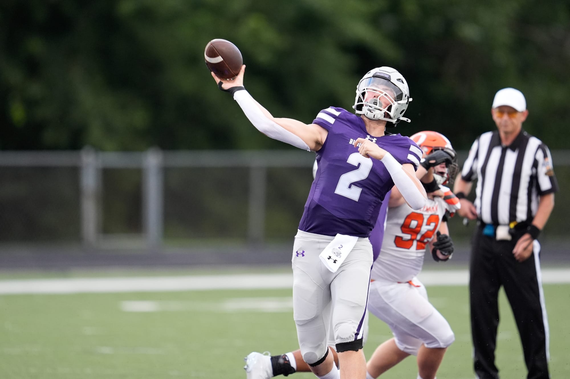 Left: Panthers quarterback Duncan Combs (2) launches the ball downfield before Columbus East defender Ethan Gilley (92) can get to him. (Dave Quick, Aug. 22, 2025) Right: Cougar quarterback John Bargen (18) launches the ball down the field. (Amy Mason, Aug. 22, 2025)