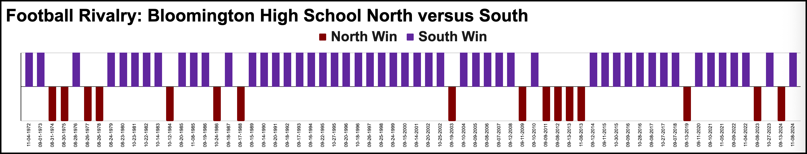 The schools have matched up on the gridiron 66 times since 1972. Over that half a century, South has dominated the series, winning 50 times. But North has evened things up lately. Since 2023, the teams have met four times and split the results, 2–2. South won the most recent contest, a 27–3 win in the Class 5A sectional final on Nov. 8, 2024.