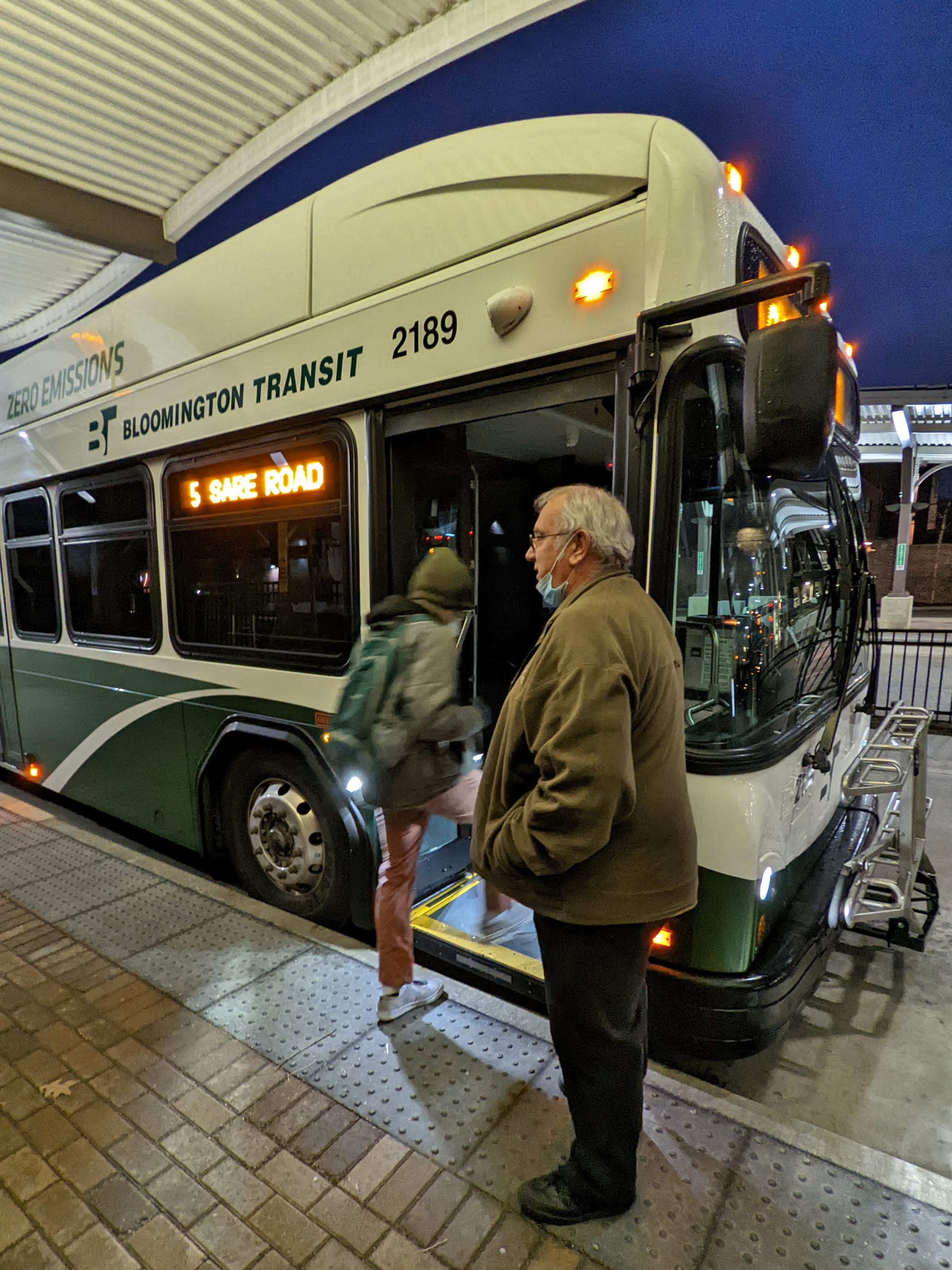 On Friday morning, driver Donny Reynolds was posted outside the Route #5 bus at Bloomington’s downtown transit center, greeting a couple of passengers as they boarded.