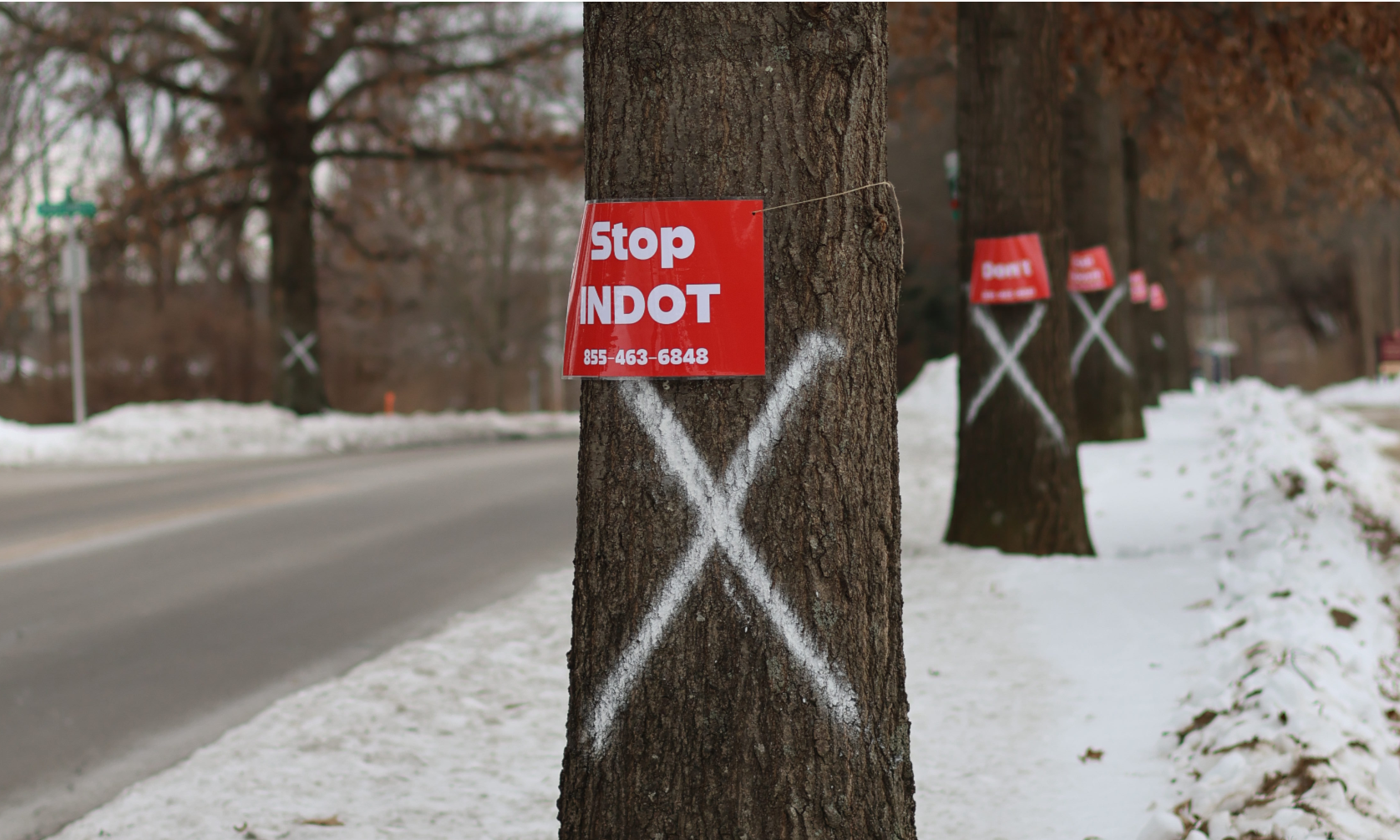 Red signs that read: "Stop INDOT 855-463-6848" have been tied around the trees that have been marked with white Xs to indicate the are to be cut down to make way for a road project.