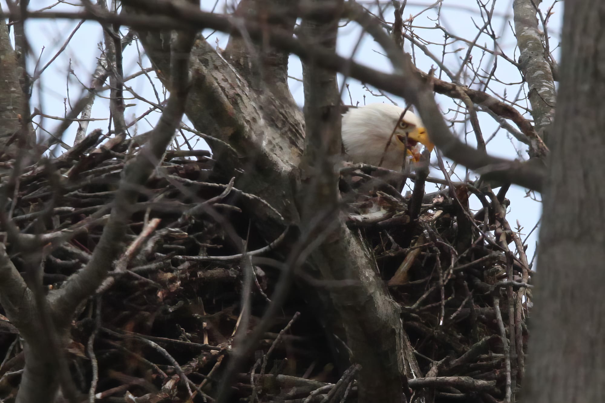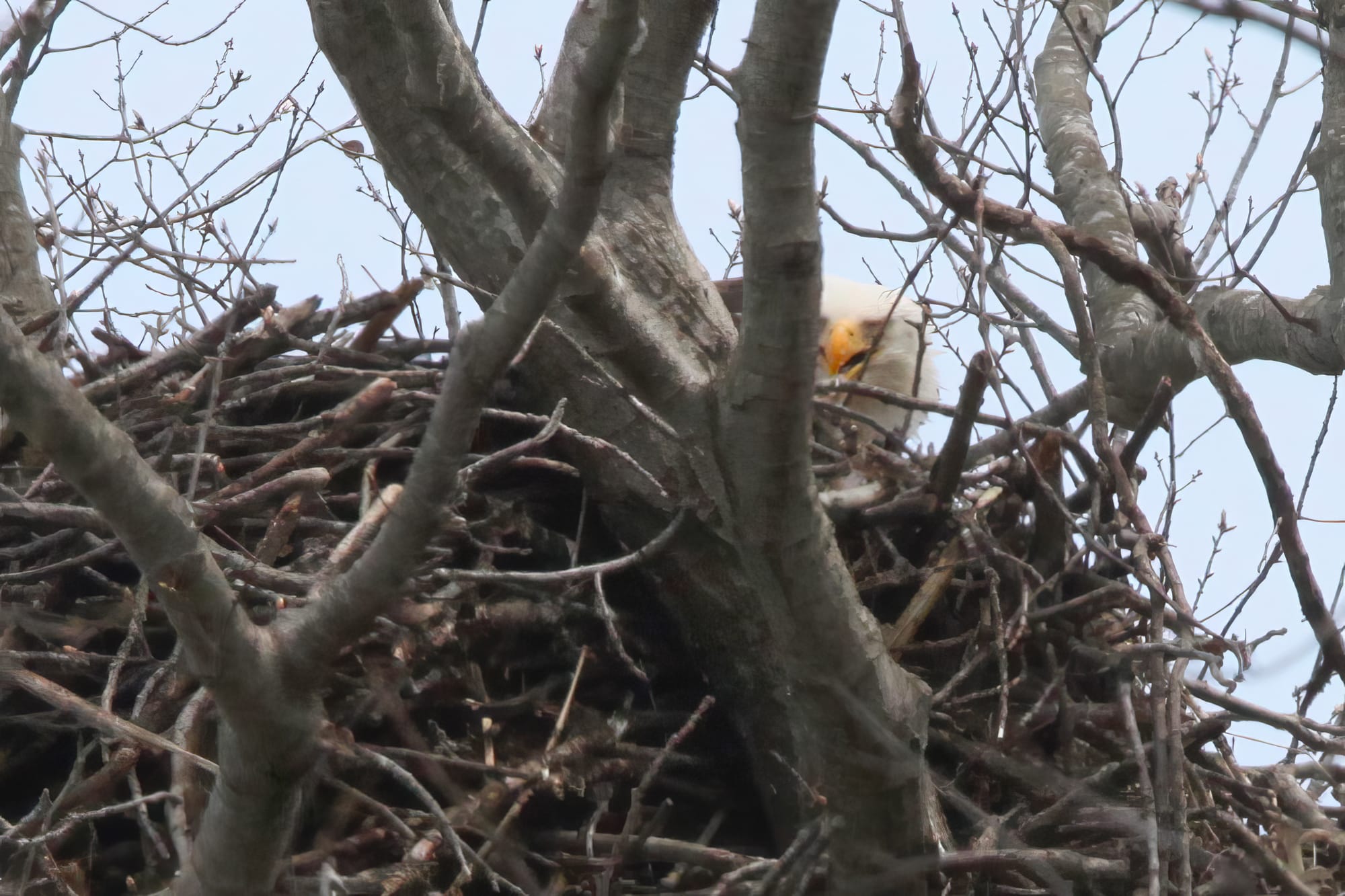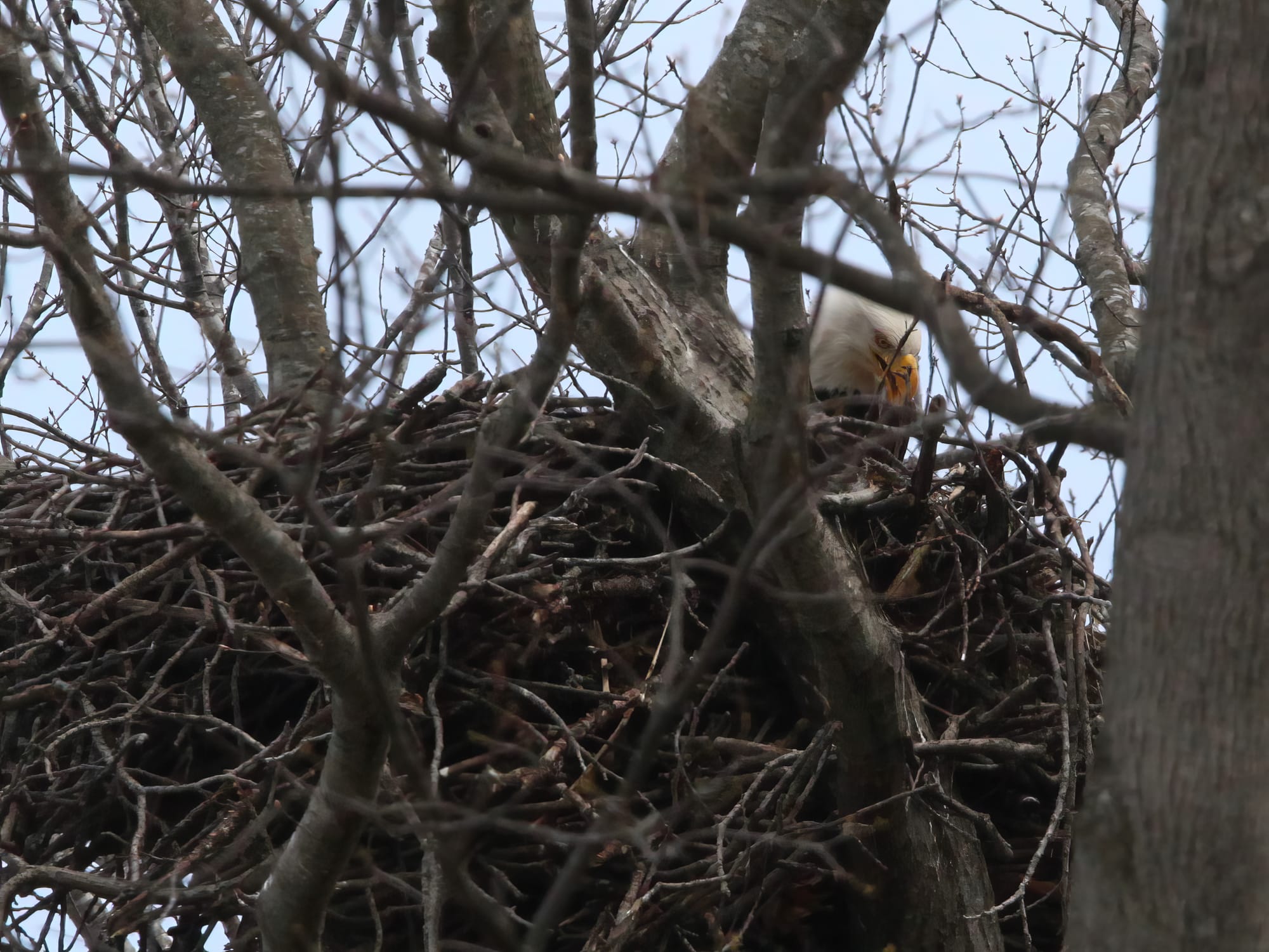 But on two visits in as many days, The B Square saw both adults perched outside the nest, then fly in, to futz around inside. Even if there were no fluffy-headed eaglets visible above the rim of the nest, it seemed almost certain the adults were tending to their hatchlings. Enjoy the photos.
