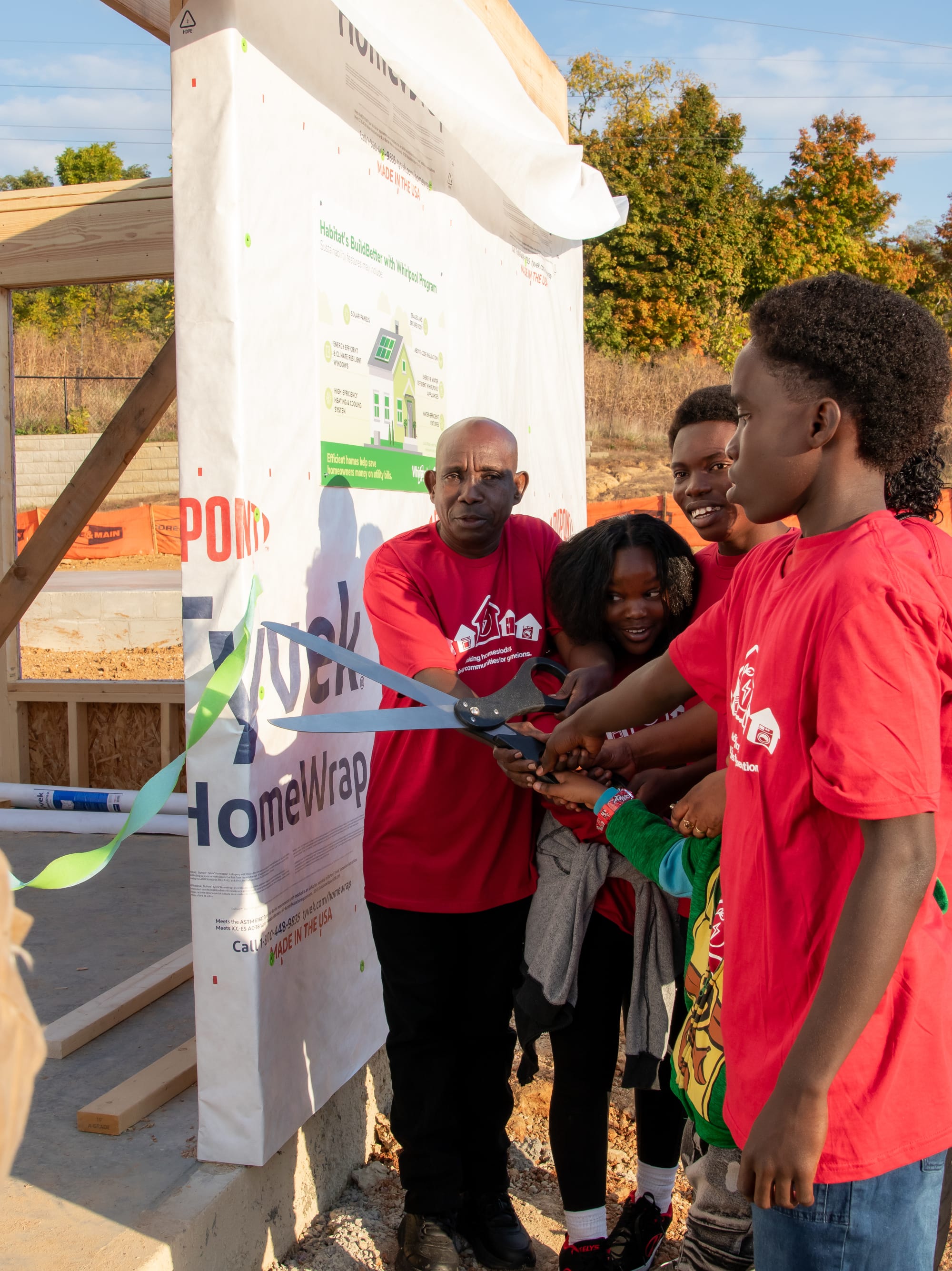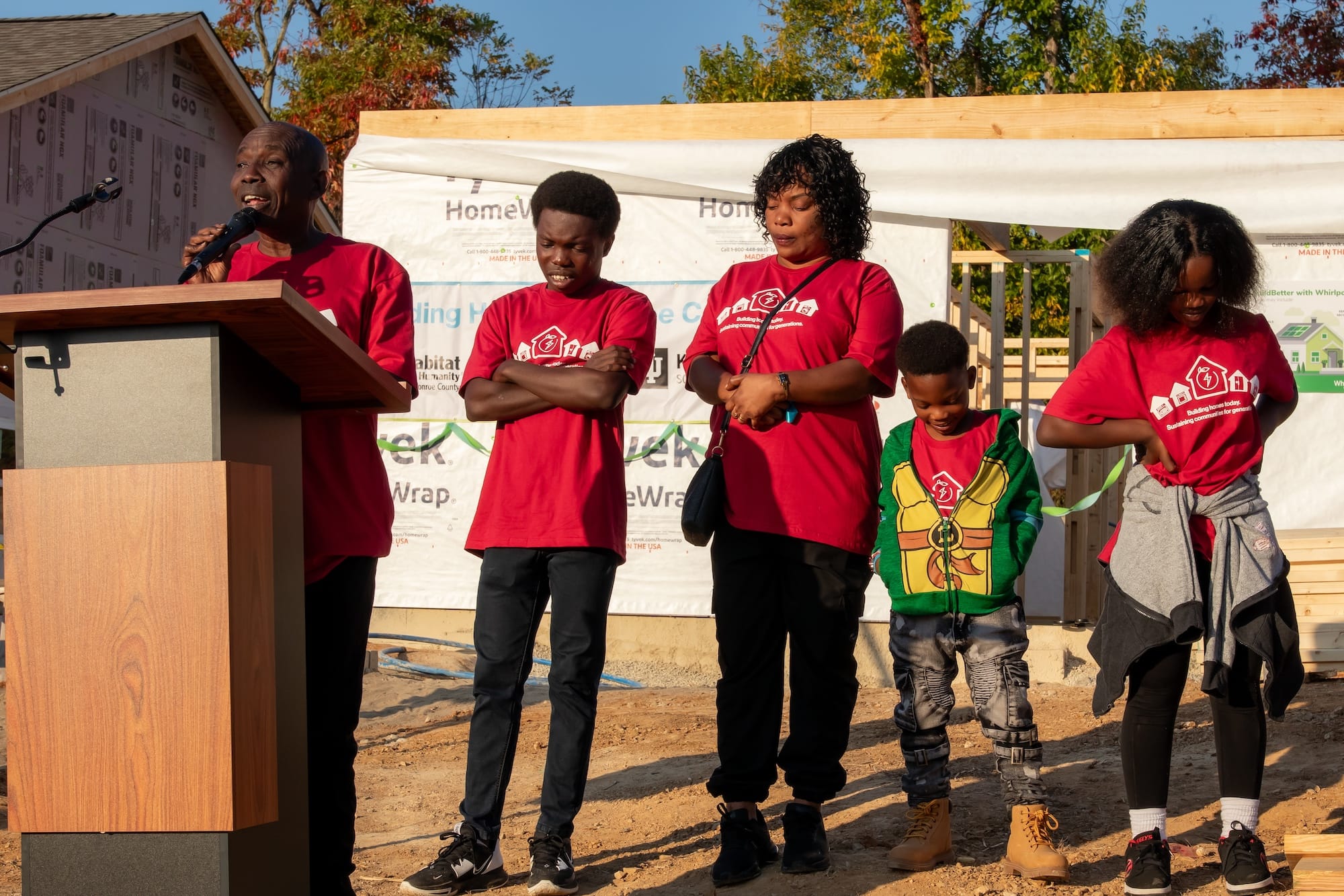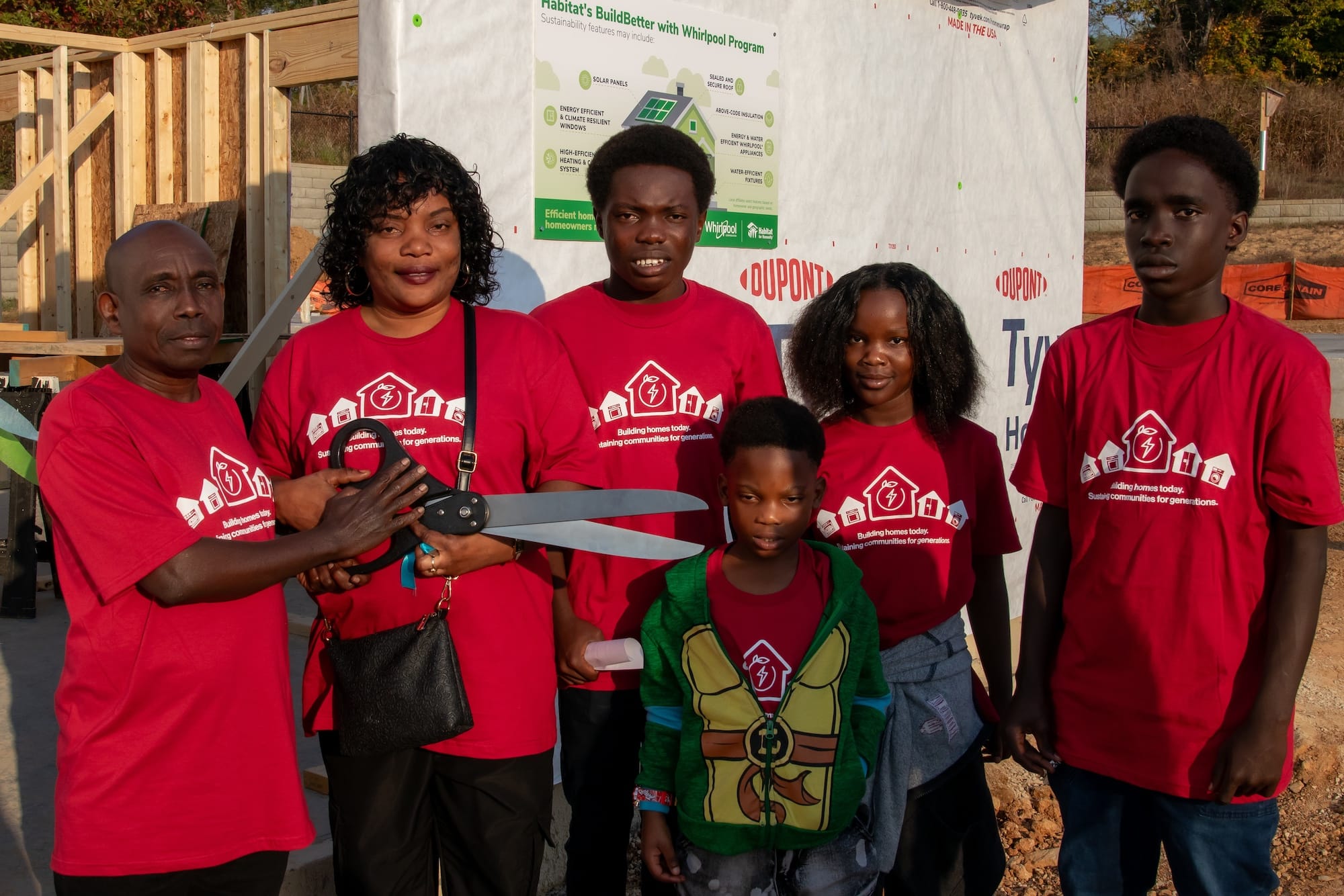 Emmanuel Ngongo Kanamuli, Onga Masumbuko and their four children—Joseph (16), Orly (14), Elisabeth (11), and Gael (7)—cut the ribbon to their new Habitat home. (Juliette Kniola, Oct. 18, 2025 )