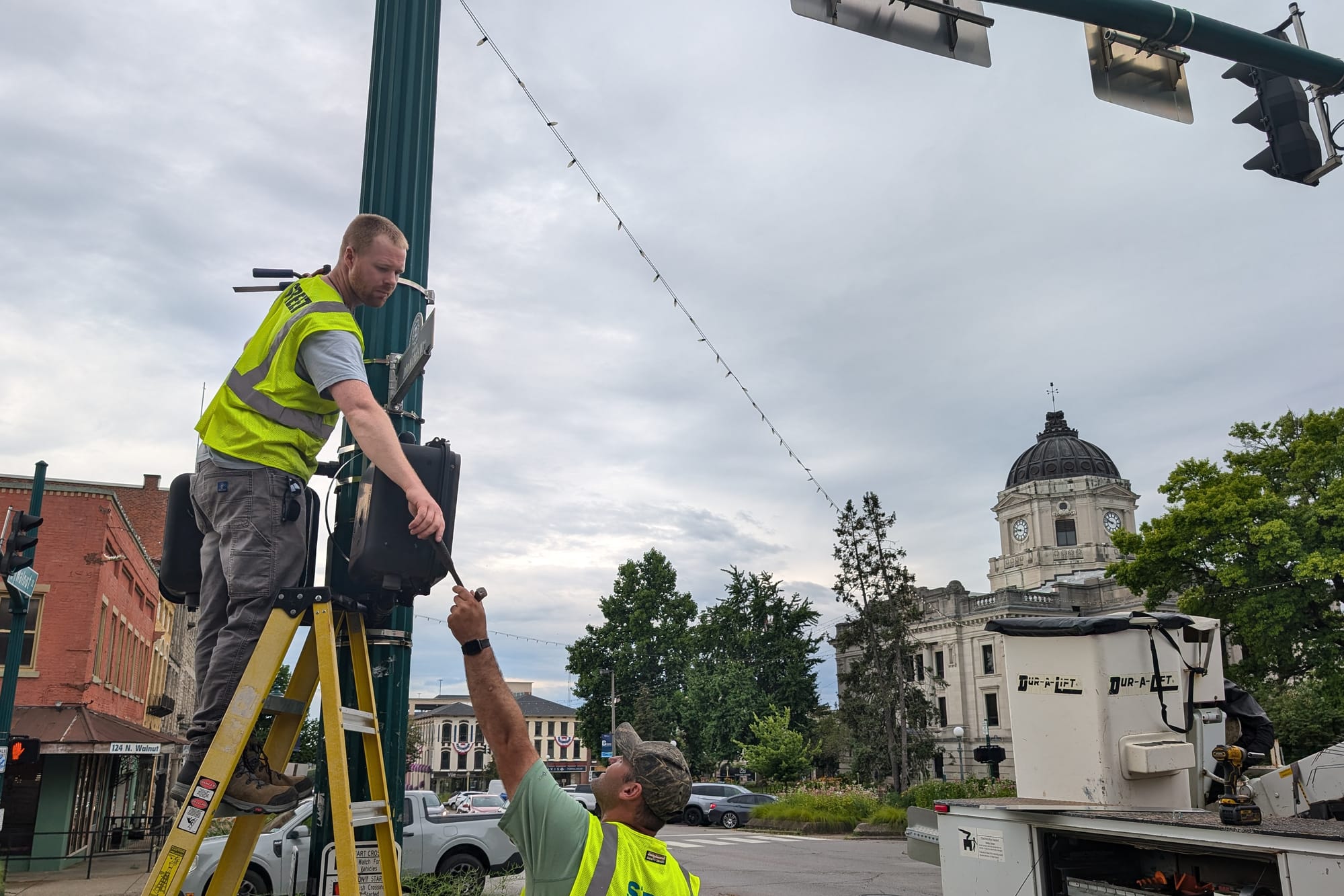 From mid through late morning, Bloomington mayor’s office staff were out and about checking in with city street crews repairing damage to signs and signals among other things. The B Square encountered deputy mayor Gretchen Knapp and communications director Desiree DeMolina as they returned to city hall.