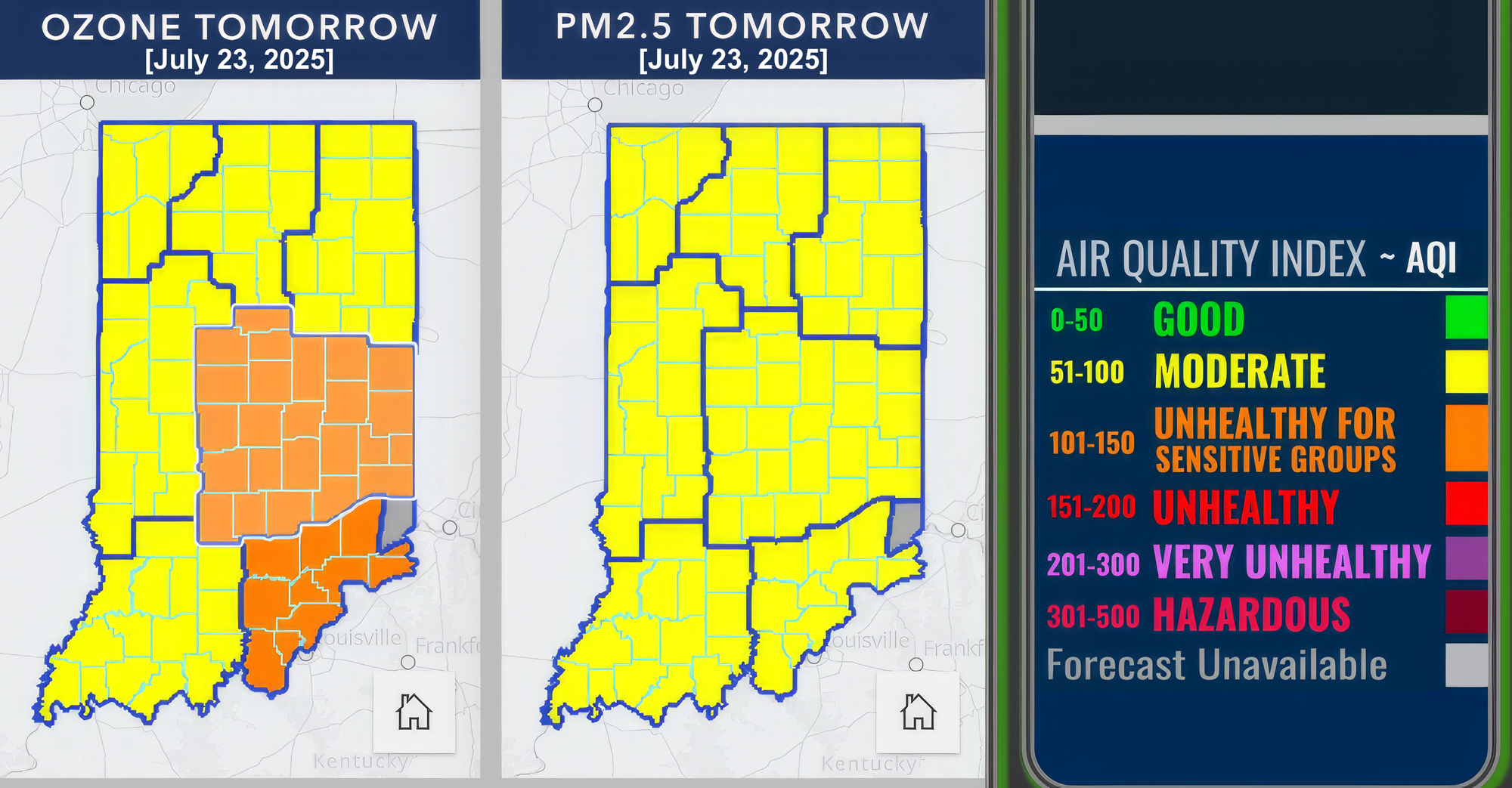 Left: The image is from a dynamic map by The B Square. Right: The image is from www.in.gov/idem/airmonitoring/smogwatch .