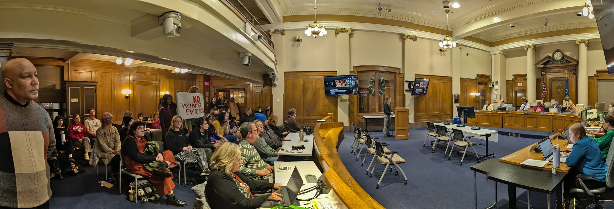 Left: The audience of the Monroe County council meeting on Tuesday include a couple dozen protestors. One holds a sign that reasd “No Winter Evictions” Right: Monroe County councilors listen to commentary from the public mic. From left to right: Marty Hawk, David Henry, Peter Iversen, Jennifer Crossley, Trent Deckard, Kate Wiltz, and Liz Feitl. (Dave Askins, Dec. 9, 2025)