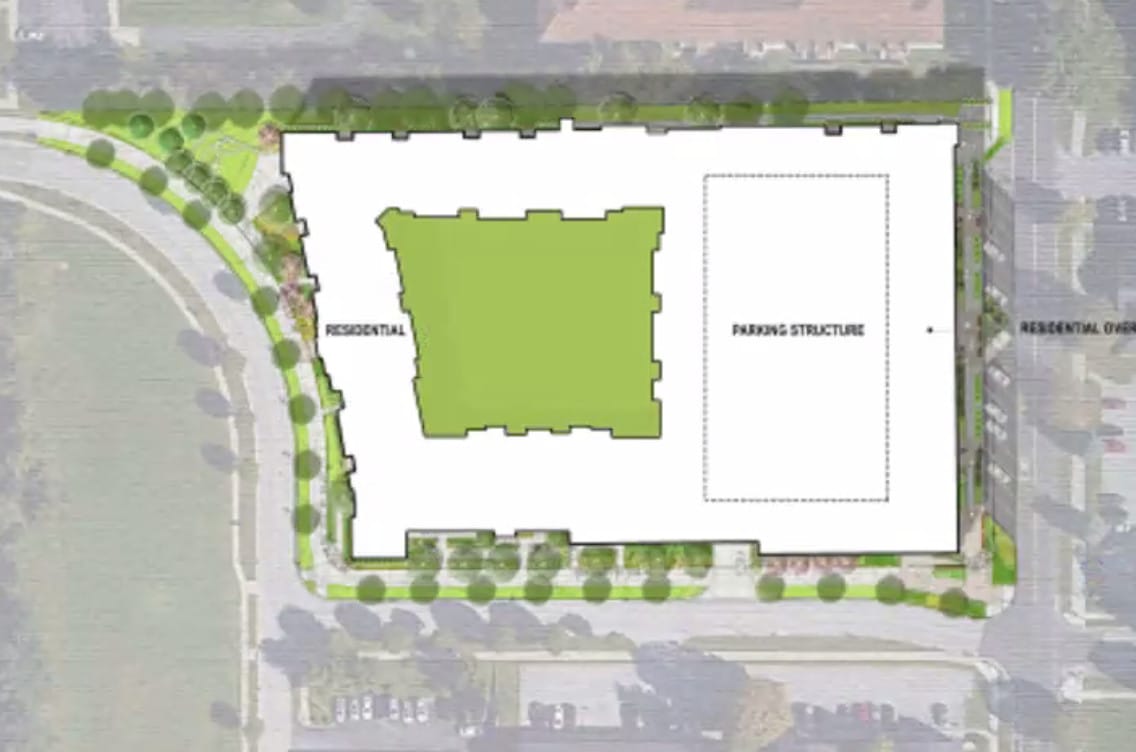 The lot is not yet developed with the project that the new zoning allowed: a building with studios, 1-bedroom, and 2-bedroom apartments totaling 344-bedrooms, which also incorporates a 306-space parking garage and 19,000 of commercial space.
