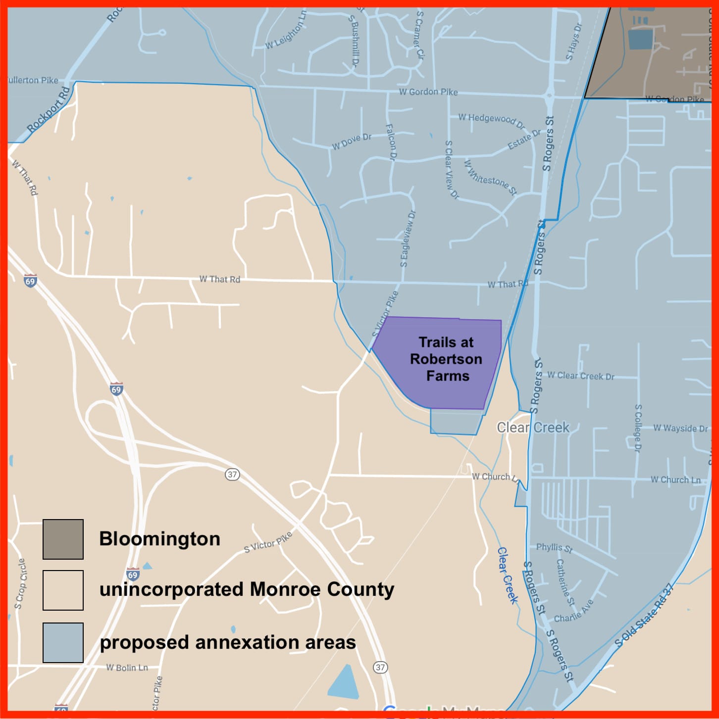 The property is nestled in the northwest intersection of the B-Line Trail and the Clear Creek Trail. It is just inside the a territory that Bloomington is trying to annex, called Area 1B.