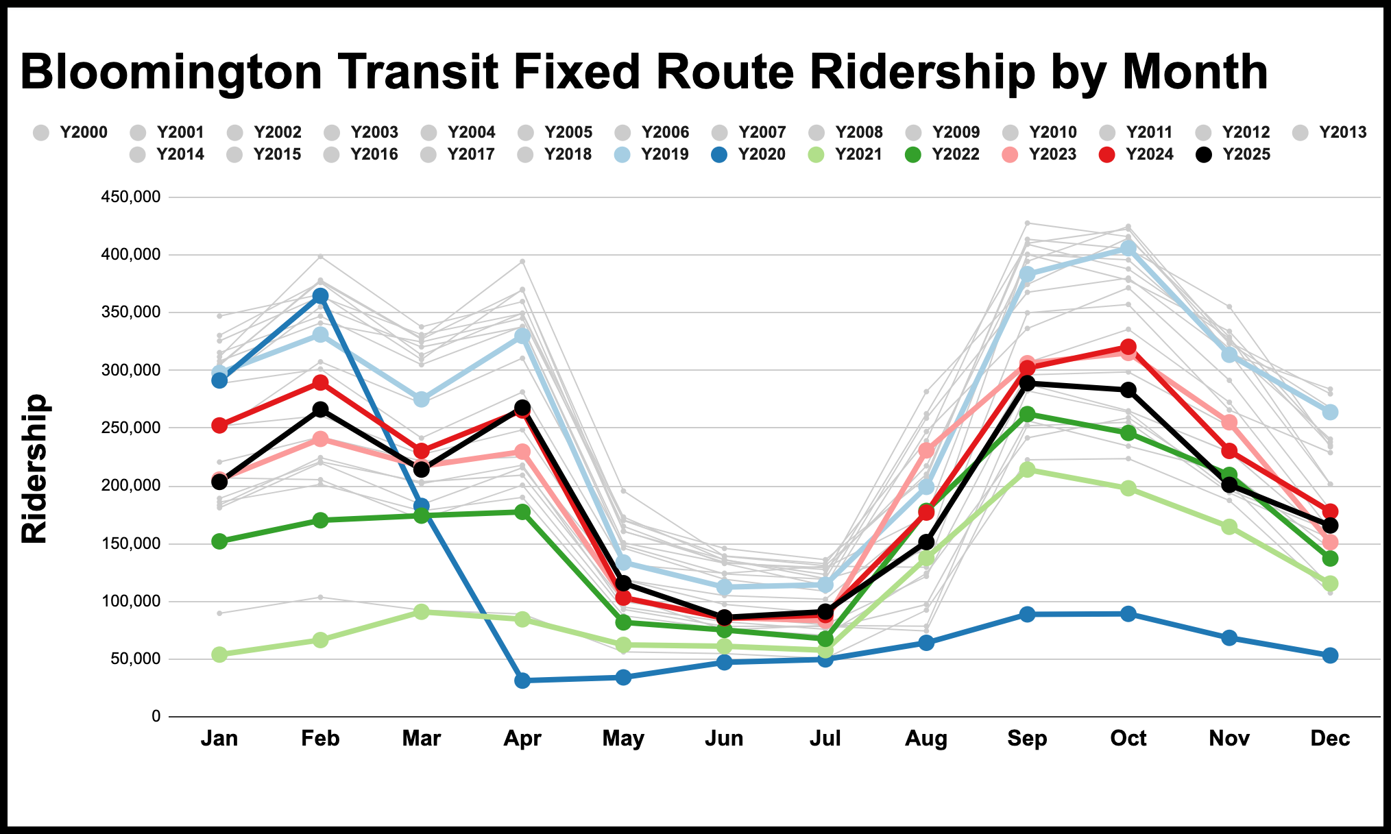 Ridership decline in 2025 for Bloomington Transit, board weighs ridership targets