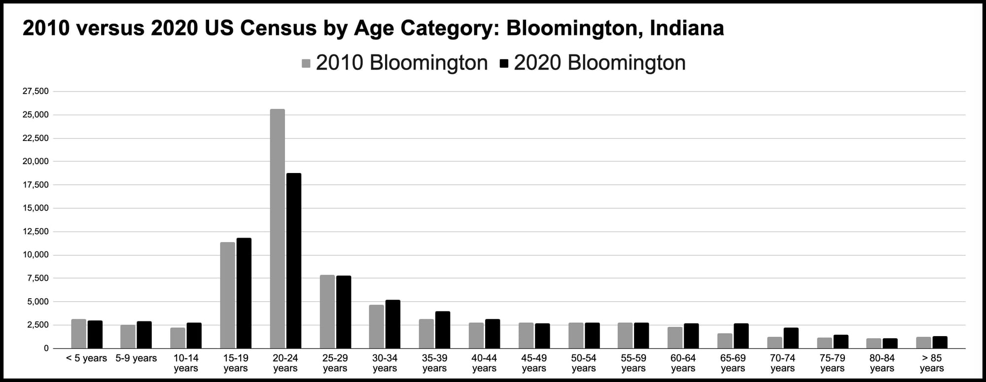 So, immediately after the 2020 census numbers were released, the expectation from many observers was that the ACS (American Community Survey) estimates starting in 2021 would show an increasing trend from the baseline of about 79,000. But that's not what the ACS numbers show. The most recent ACS estimates indicate that Bloomington is losing population. Here's the ACS trend: 78,988 (2021), 77,358 (2022) and 74,028 (2023).