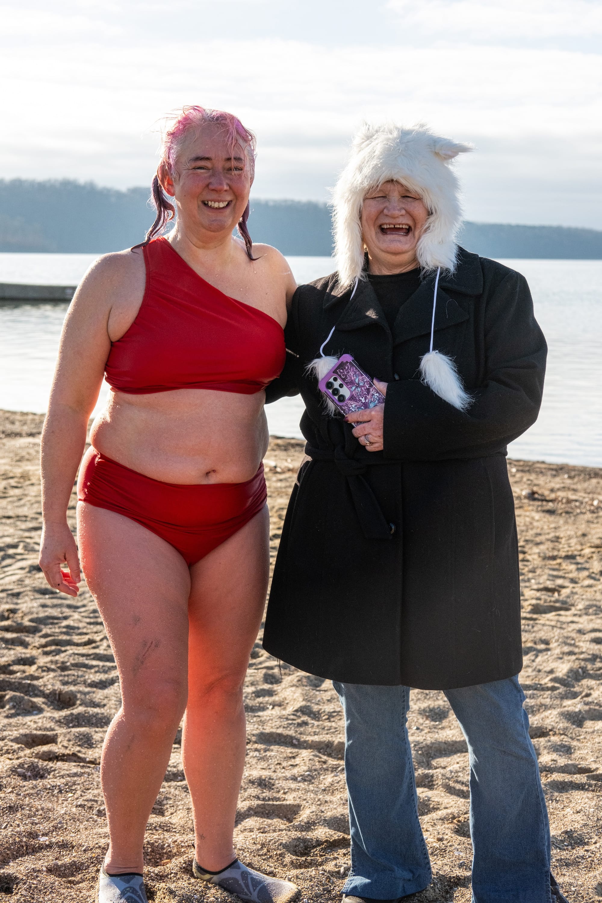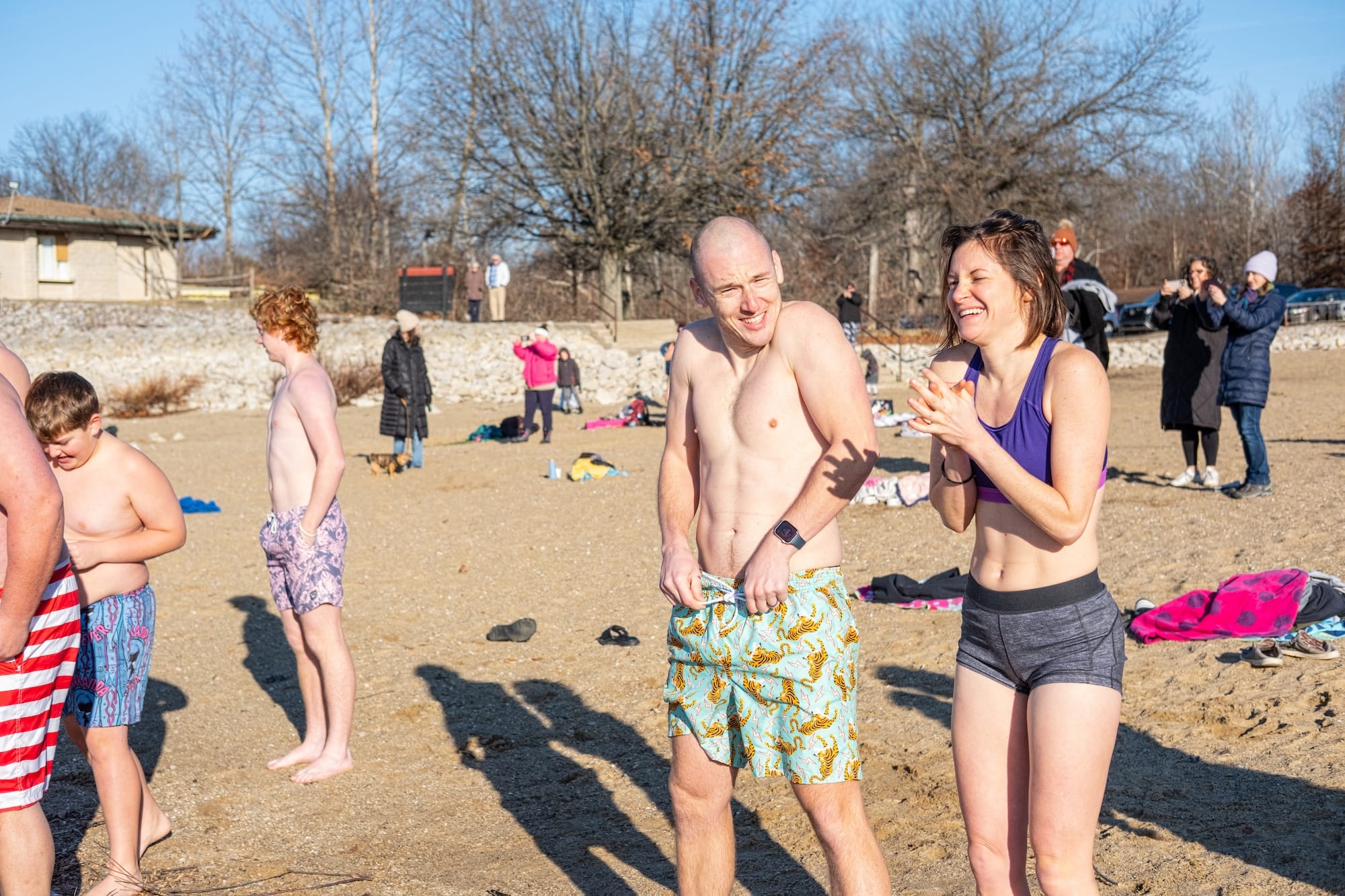 Most participants opted for a quick, full-body plunge—running in, submerging completely, and rushing back out to towels and layers. As they hit the water, several could be heard shouting variations of, “Oh, God, why did I think this was a good idea?” Only two participants lingered, remaining in the water for about five minutes. When they finally emerged, their skin was noticeably red from the cold, but both said the experience felt good and claimed the icy soak is good for you.