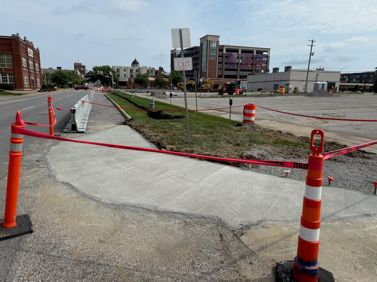 Newly poured concrete at the southwest corner of the Convention Center expansion property for one of the ADA ramps for the temporary sidewalks that will allow safe pedestrian passage during the construction project.