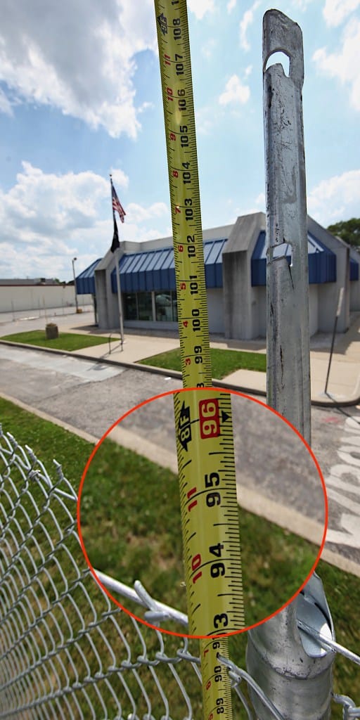 Measured by The Square Beacon, the chain-link panels of the fence are a smidgen shorter than 8 feet tall. The poles, with their extensions that could, but don’t yet, accommodate barbed wire, measure out at around 9 feet. A couple of the corner posts are about 10 feet tall.
