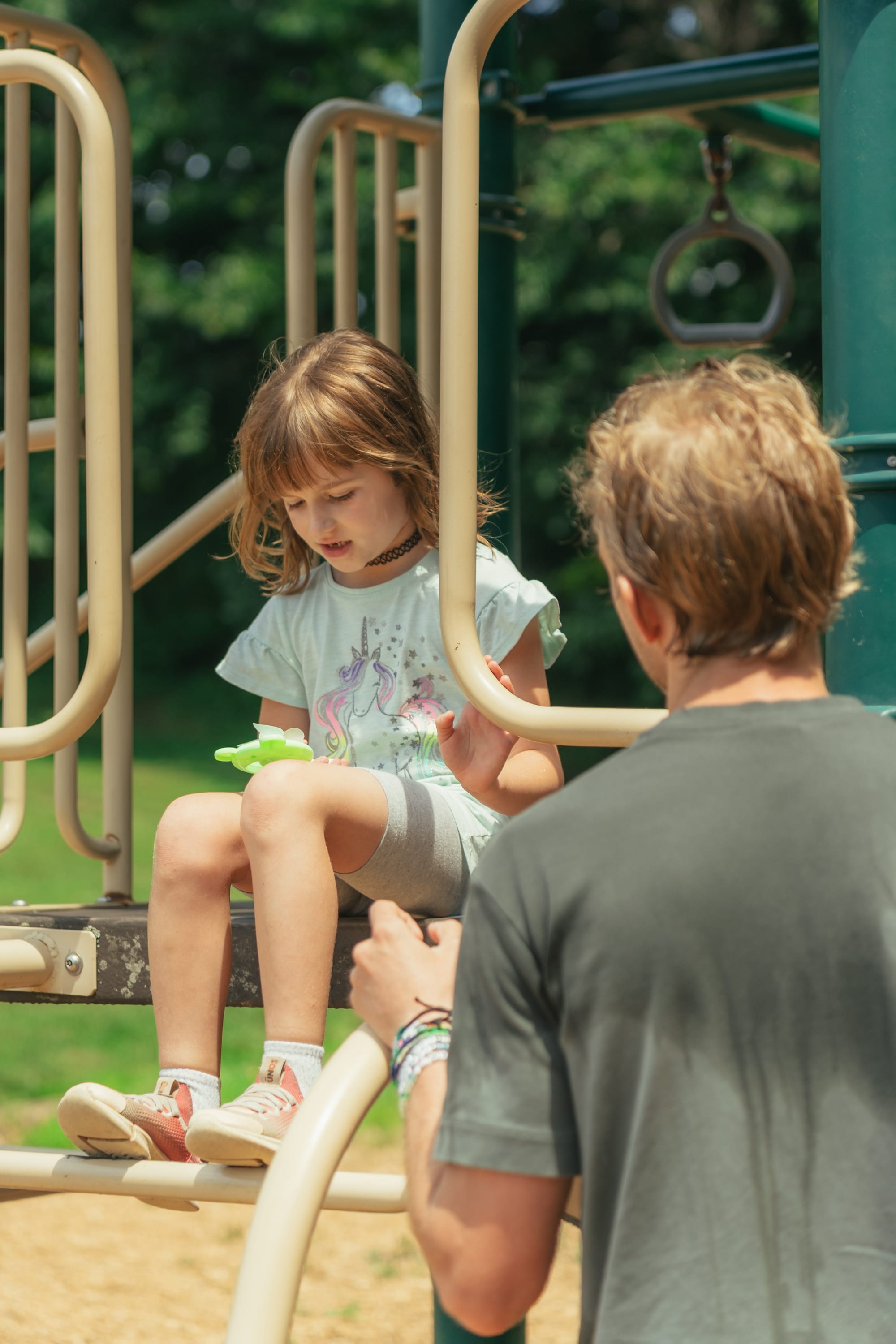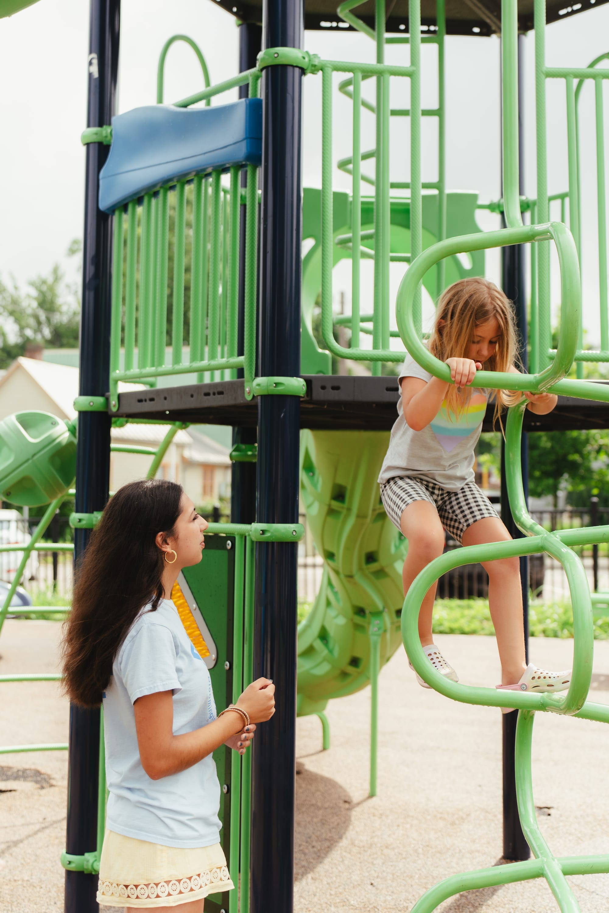 Anamika Wolfskill, Kid City assistant counselor, interacts with a camper at the Third Street Park playground. (Kelton O'Connell, June 30, 2025)