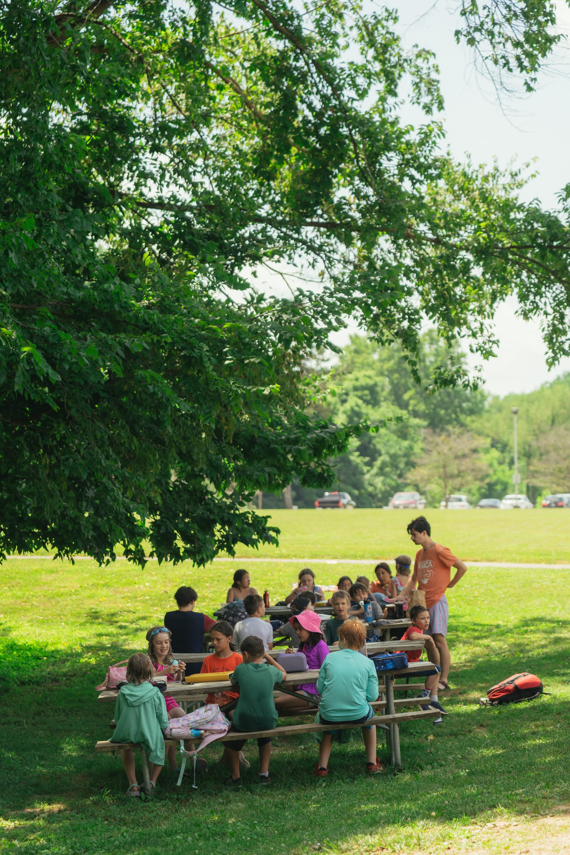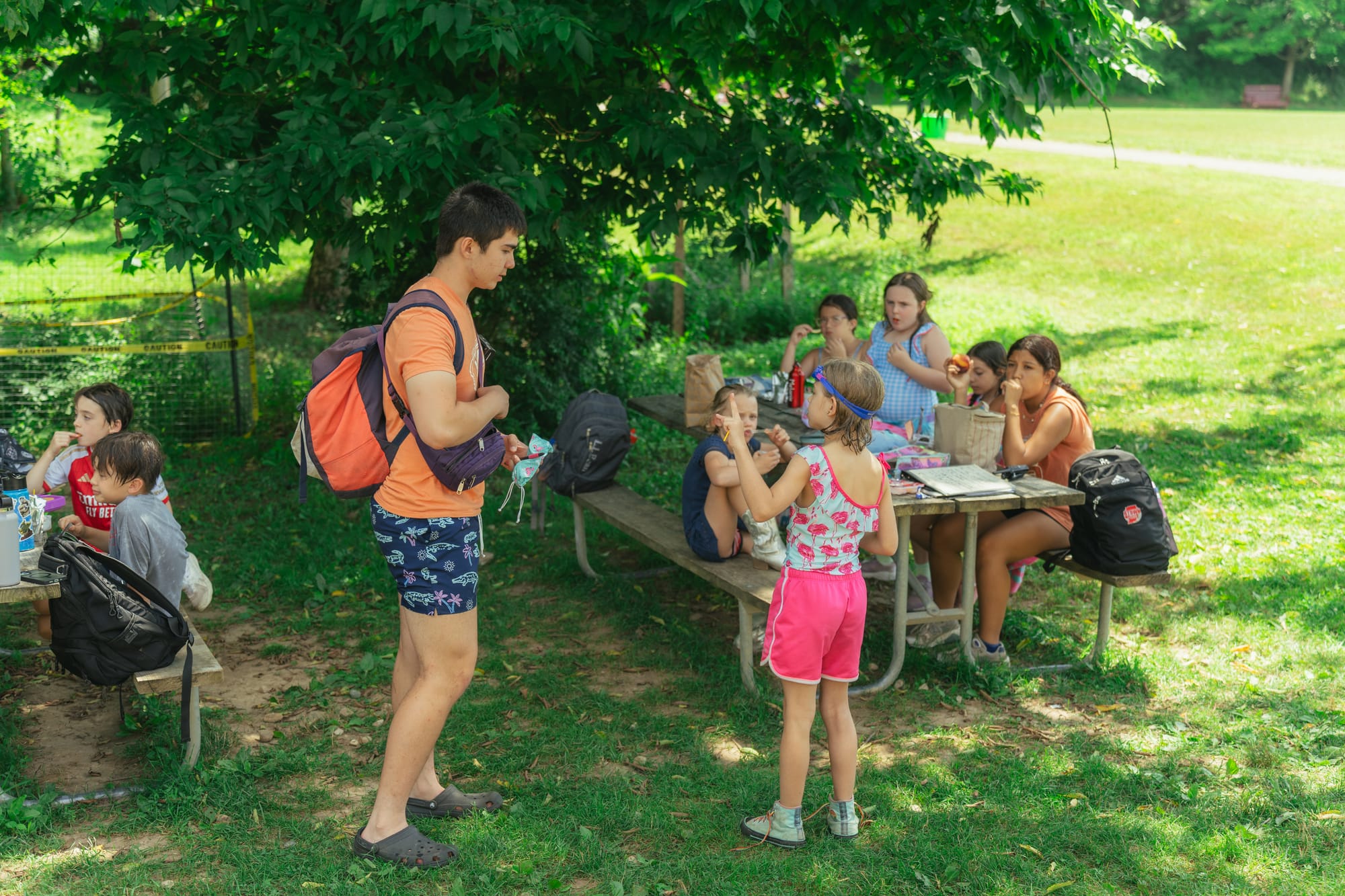 Another counselor responsibility is switching campers from one activity to another. “We’re having lunch right now; we just got back from the pool,” Wu said, as campers ate at picnic tables outside. “Going from the pool to the locker room to outside—that’s one transition.” This includes lining the kids up to move from one location to the next.
