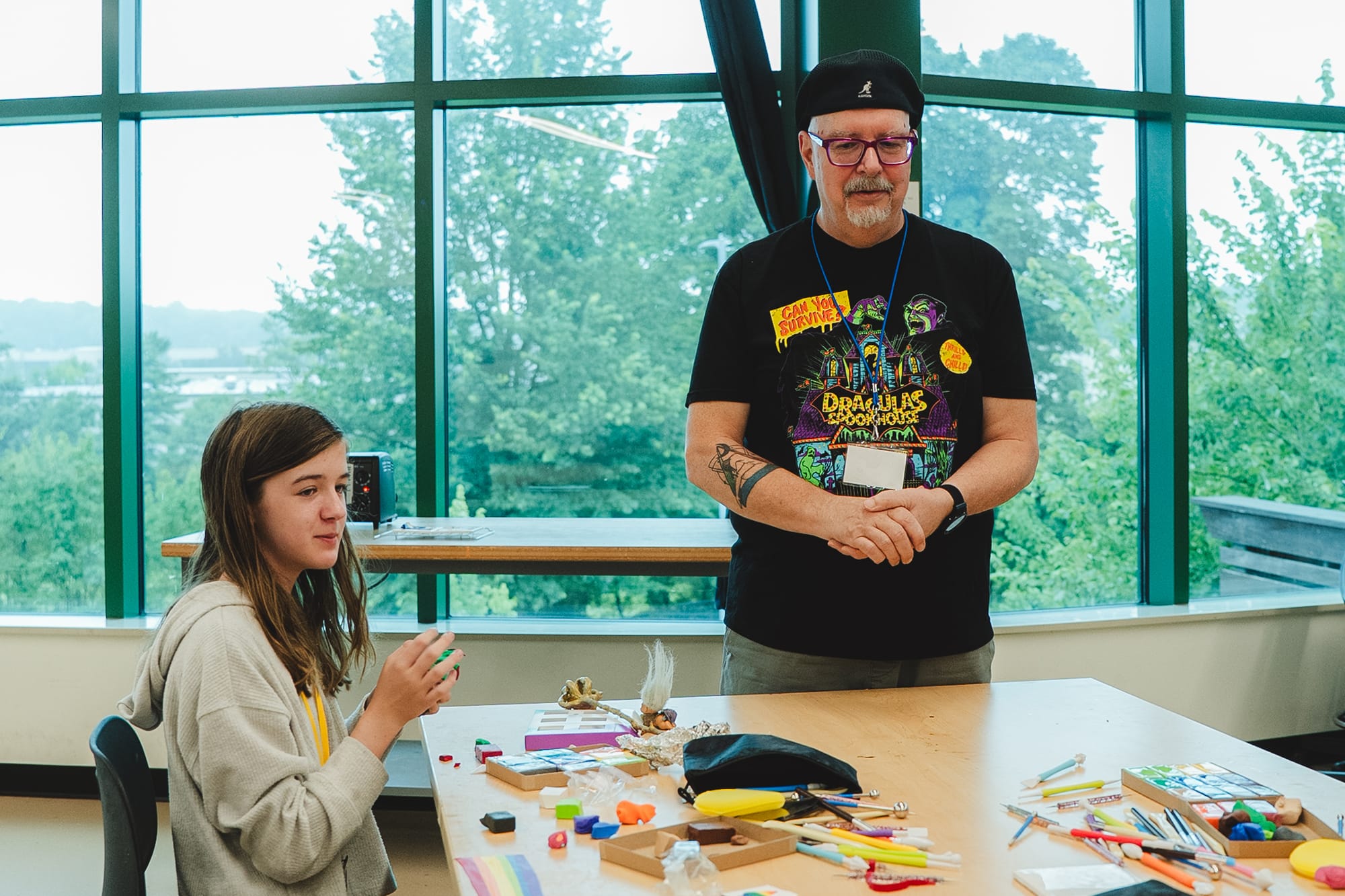 Left: Students learn from instructor Tom Hastings during magic camp. They were talking about numerology when The B Square visited. Right: Sculpting instructor Bob Wolanin works with campers. (Kelton O'Connell, July 16, 2025)