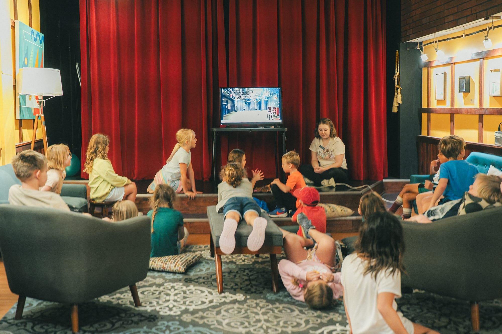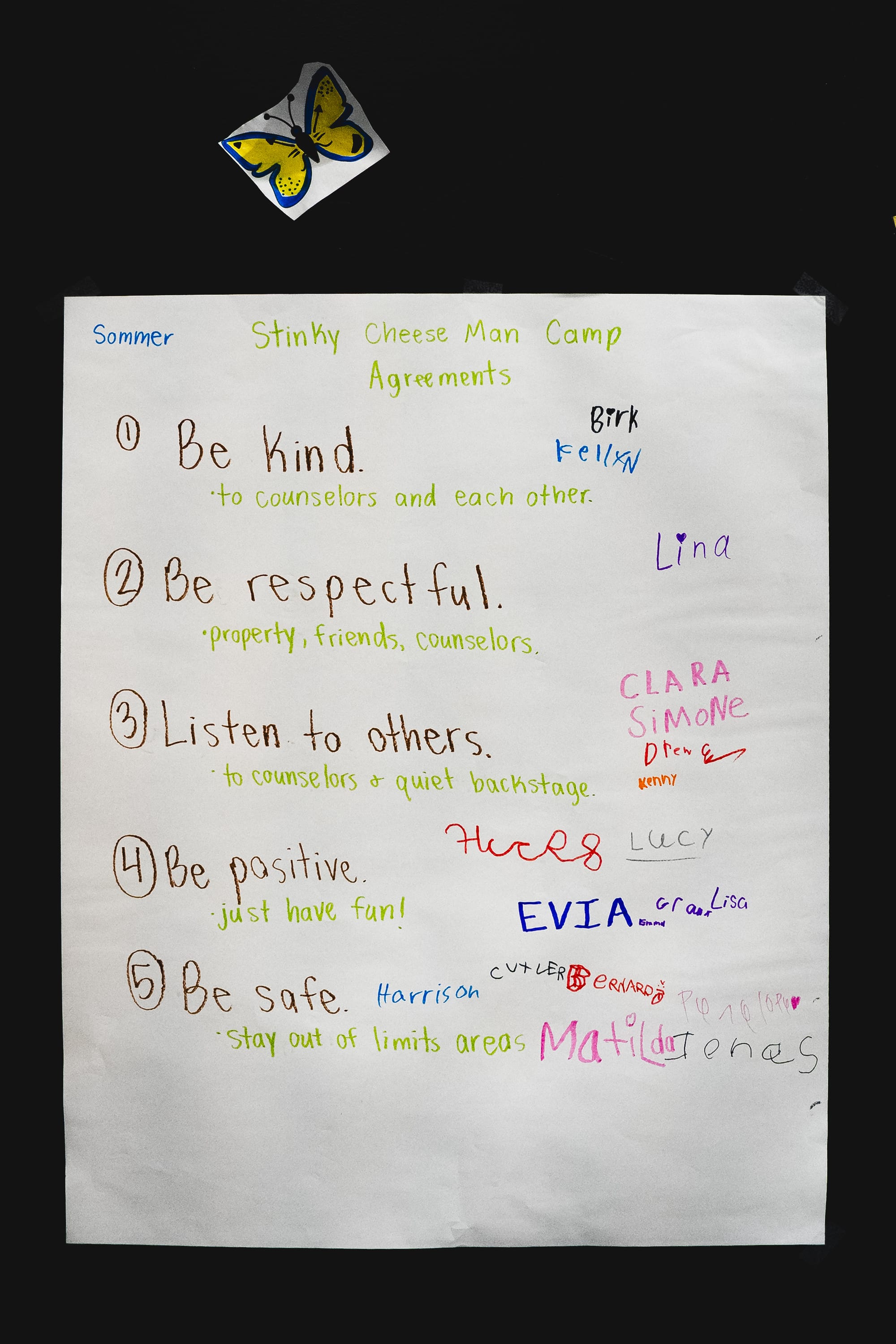 Left: Constellation's Littles theater camp watches a recording of their rehearsal to improve their performance. Right: The Constellation Littles theater camp signed this list of five affirmations. (Kelton O'Connell, July 17, 2025)