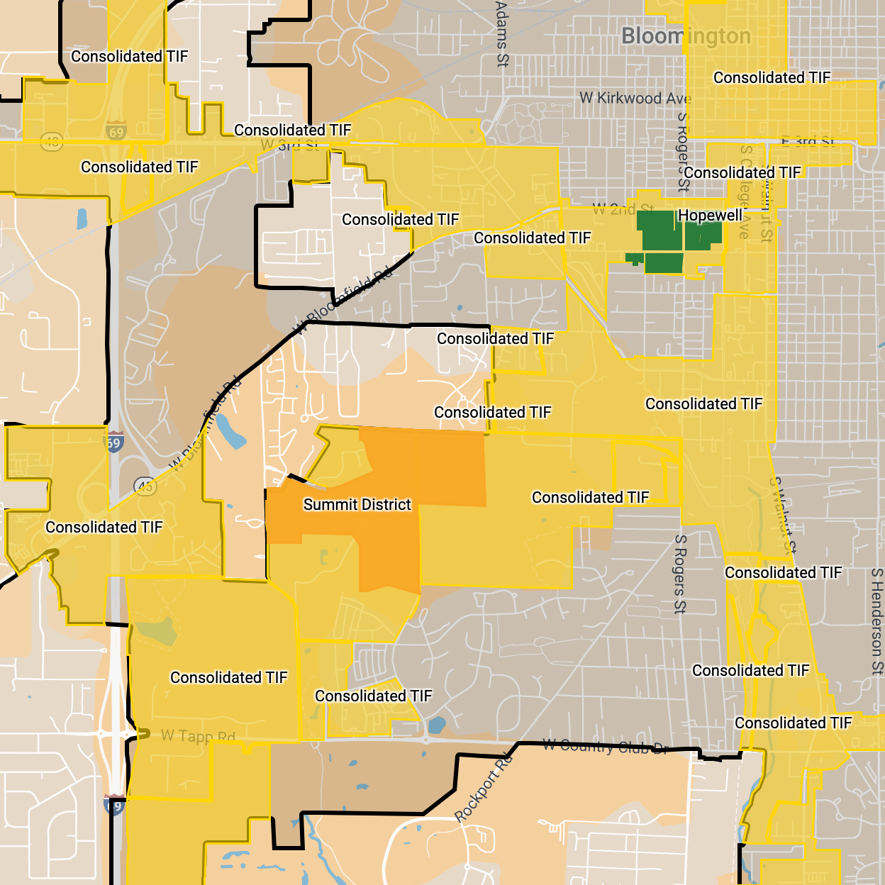 Summit District is shown in orange. Hopwell is shown in green. Bloomington’s consolidated TIF district is shown in yellow. Maps by The B Square with information from the city of Bloomington. [link to dynamic map]