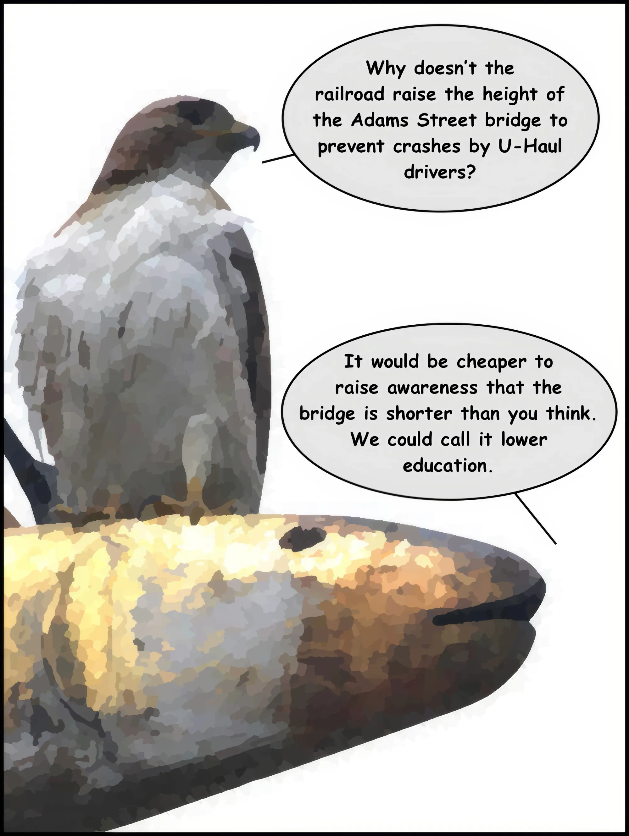 Hawk: Why doesn’t the railroad raise the height of the Adams Street bridge to prevent crashes by U-Haul driver? What do you think Fish says in reply?