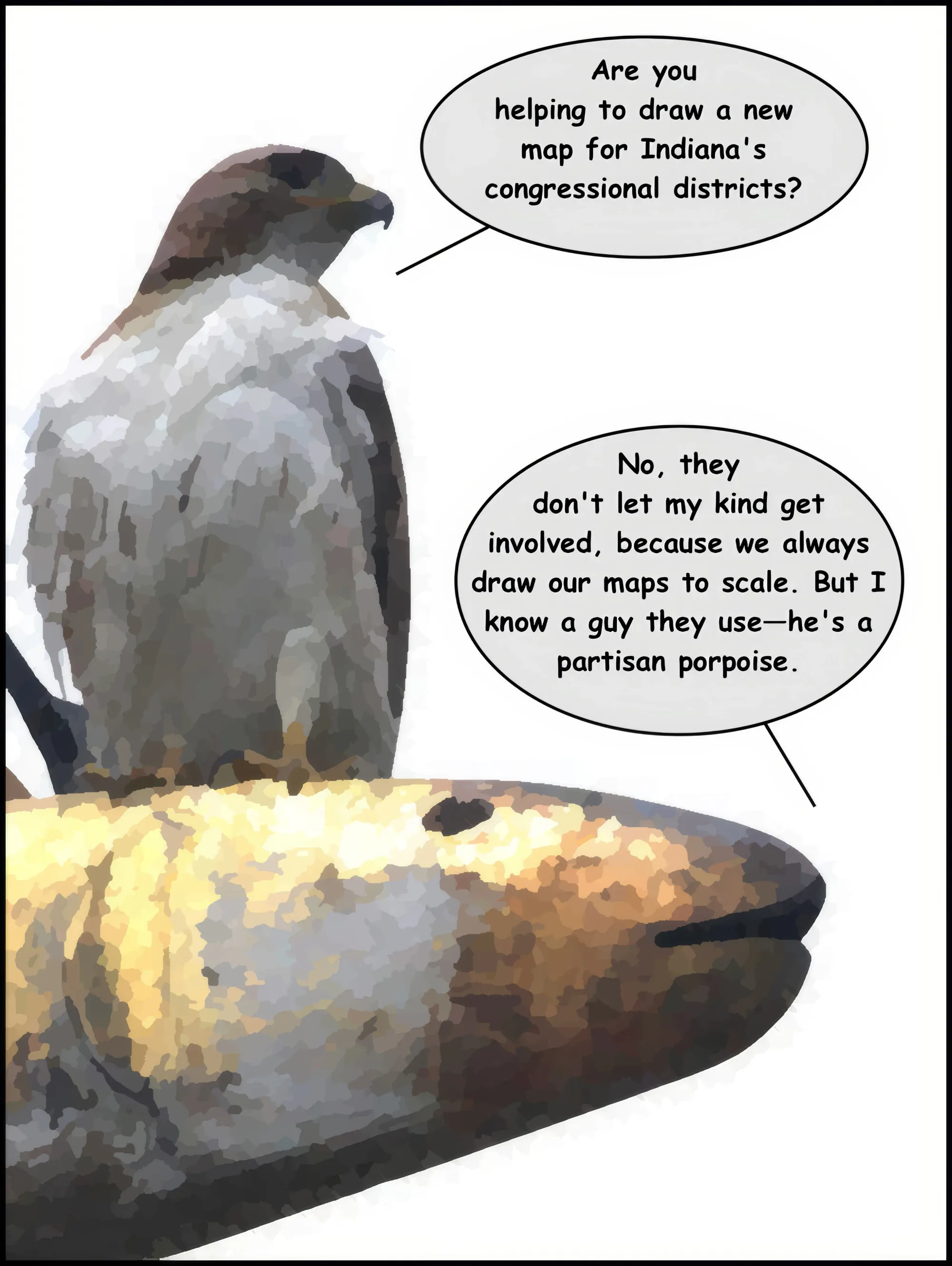 On top of the historic Monroe County courthouse there is a weathervane featuring a metal fish crafted by blacksmith Austin Seward, which is called Hoagy as the result of a naming contest in 2018. Sometimes, one of the red-tailed hawks that lives in downtown Bloomington will land on the fish. The art for the cartoon was made by applying a software filter to a photograph of that scene.