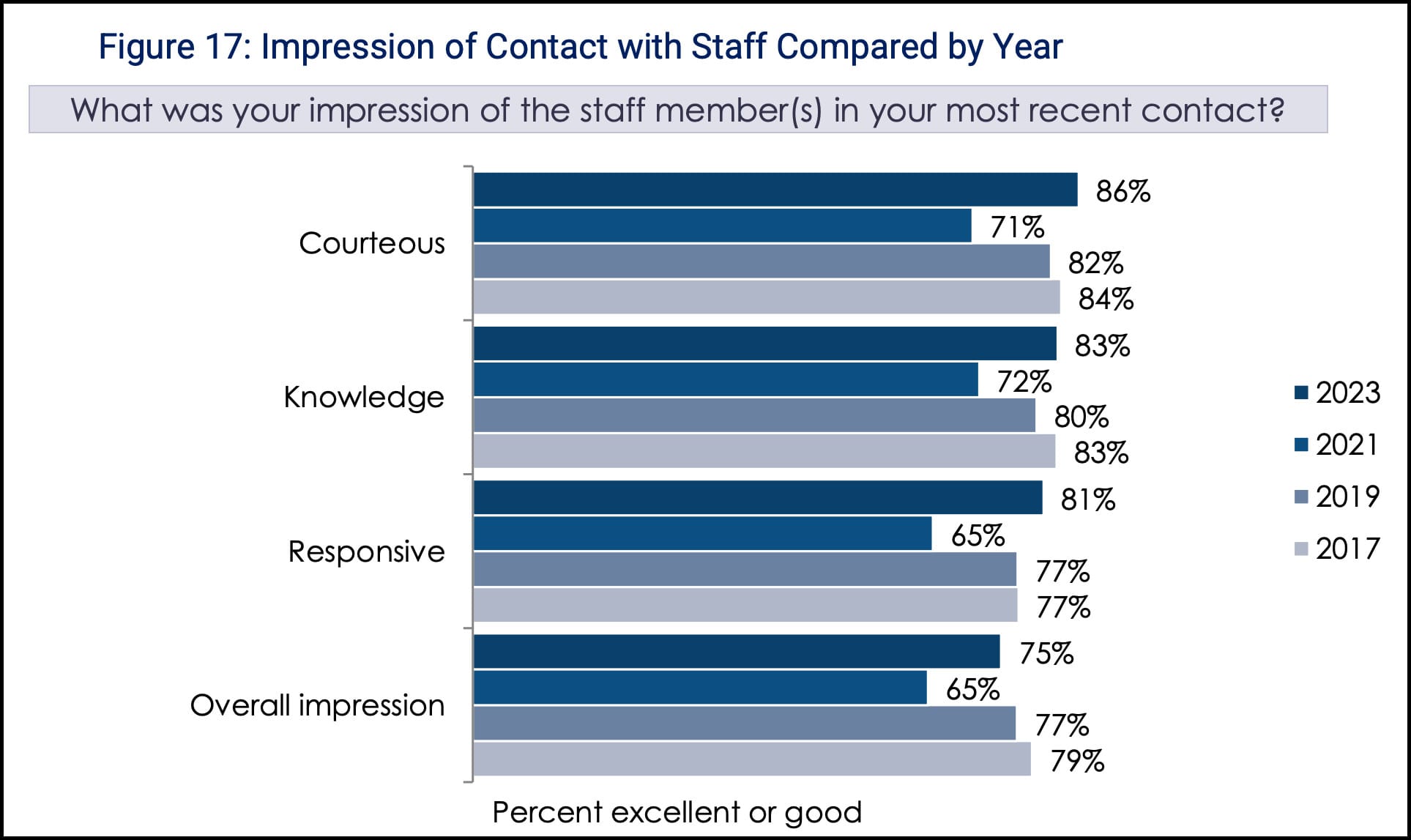 As an example, the rating of respondents of the staff as “courteous” increased from 71 percent to 86 percent between 2021 and 2023—which is 2 points better than the 84 percent recorded in the 2017 survey.