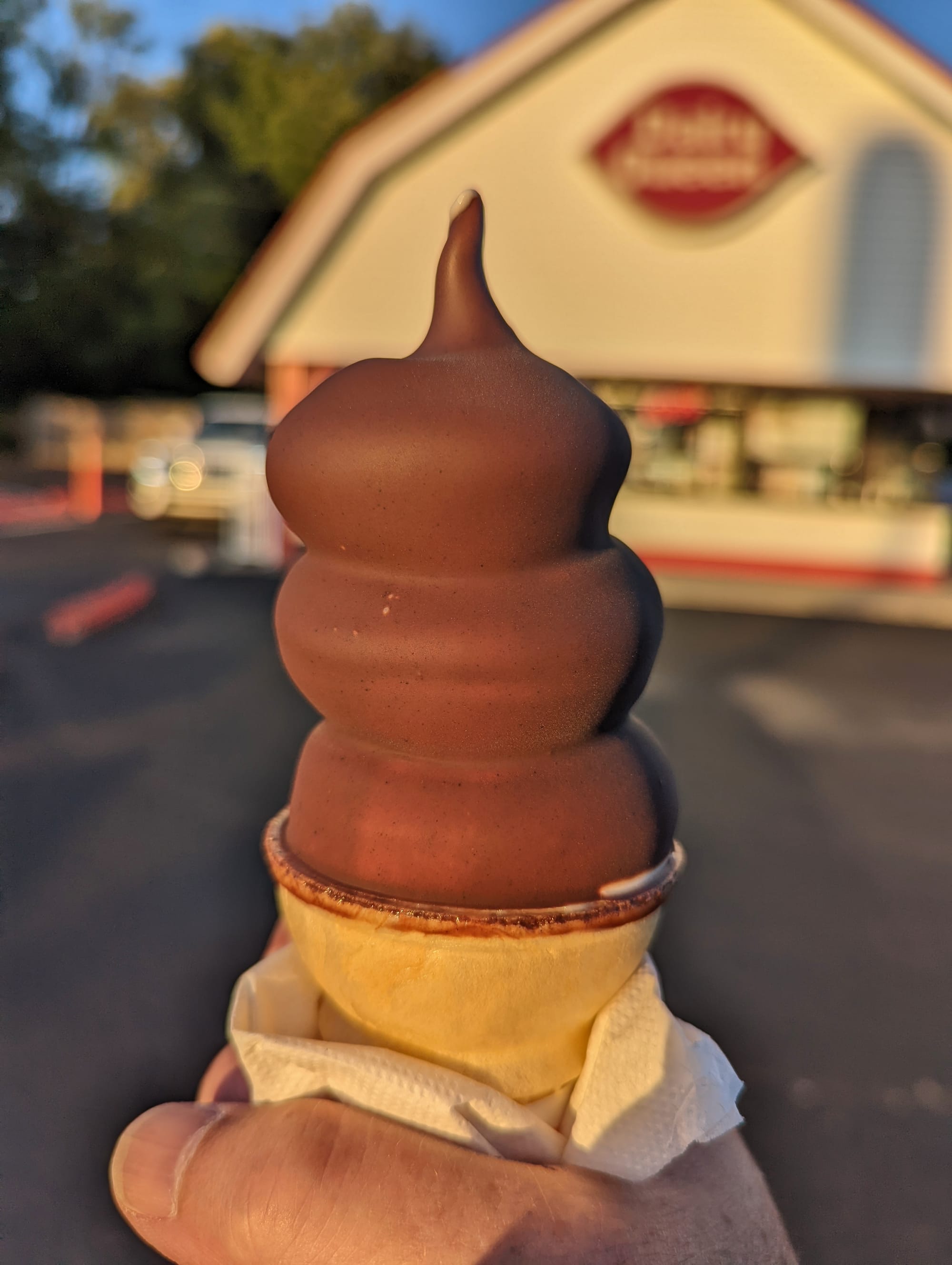 The Dairy Queen’s walkup window is closed, so arriving on foot, after a bus ride, meant standing in line with cars waiting in the drive-thru. Without any mishaps, The B Square was able to achieve the goal of the expedition—a vanilla ice cream cone dipped in chocolate.
