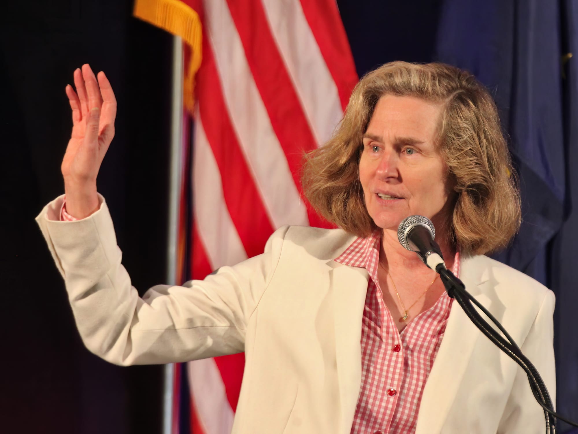 The same sound was a little louder when it came from a woman seated at a table at the event itself, when she called out a question to Young: "Do immigrants deserve due process—yes or no?" Young's answer—in the moment and to a follow up during the post-event press scrum—came with some nuance, but could be analyzed as a yes.
