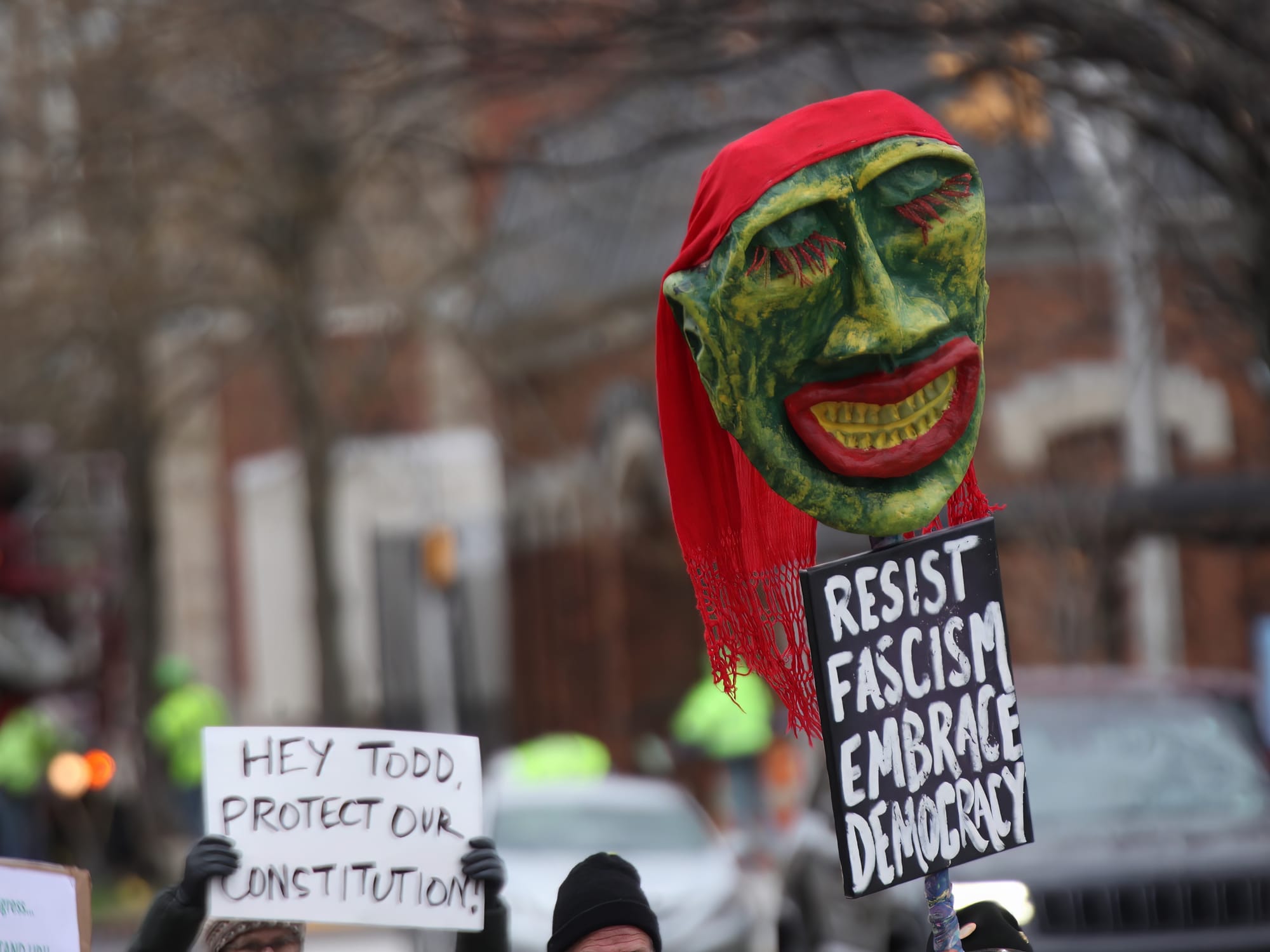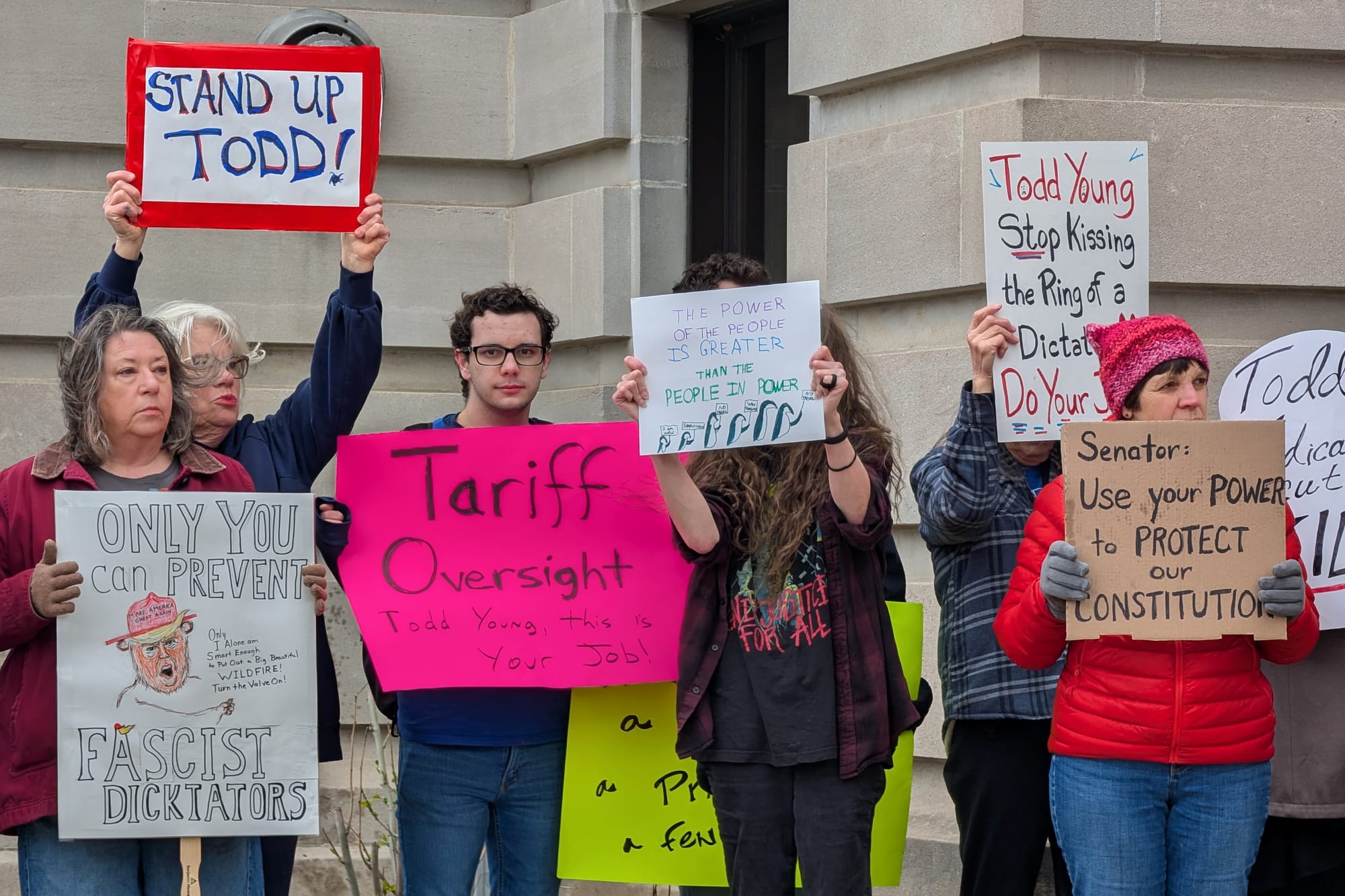 The demonstrators held signs with exhortations to Young like, "Hey Todd, Protect our Constitution!" and "Senator Young!!! Defend the Constitution, not the Donald."