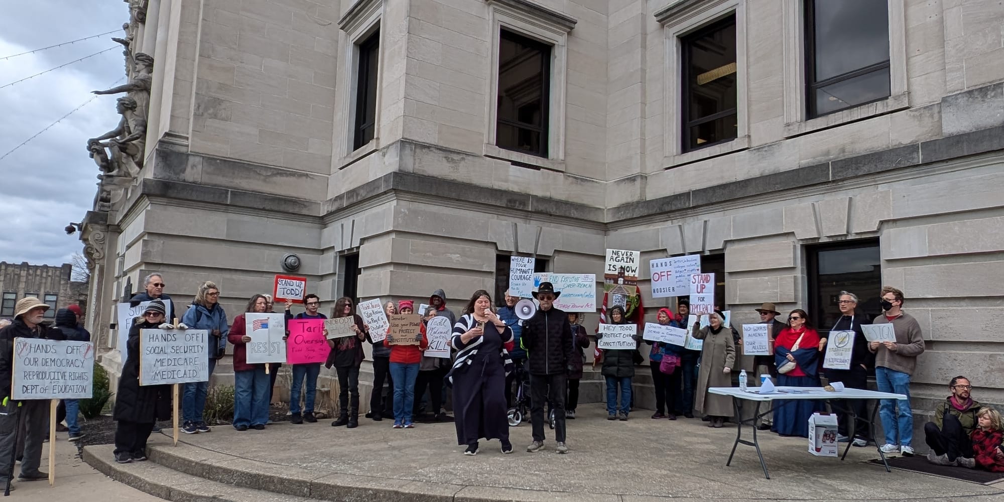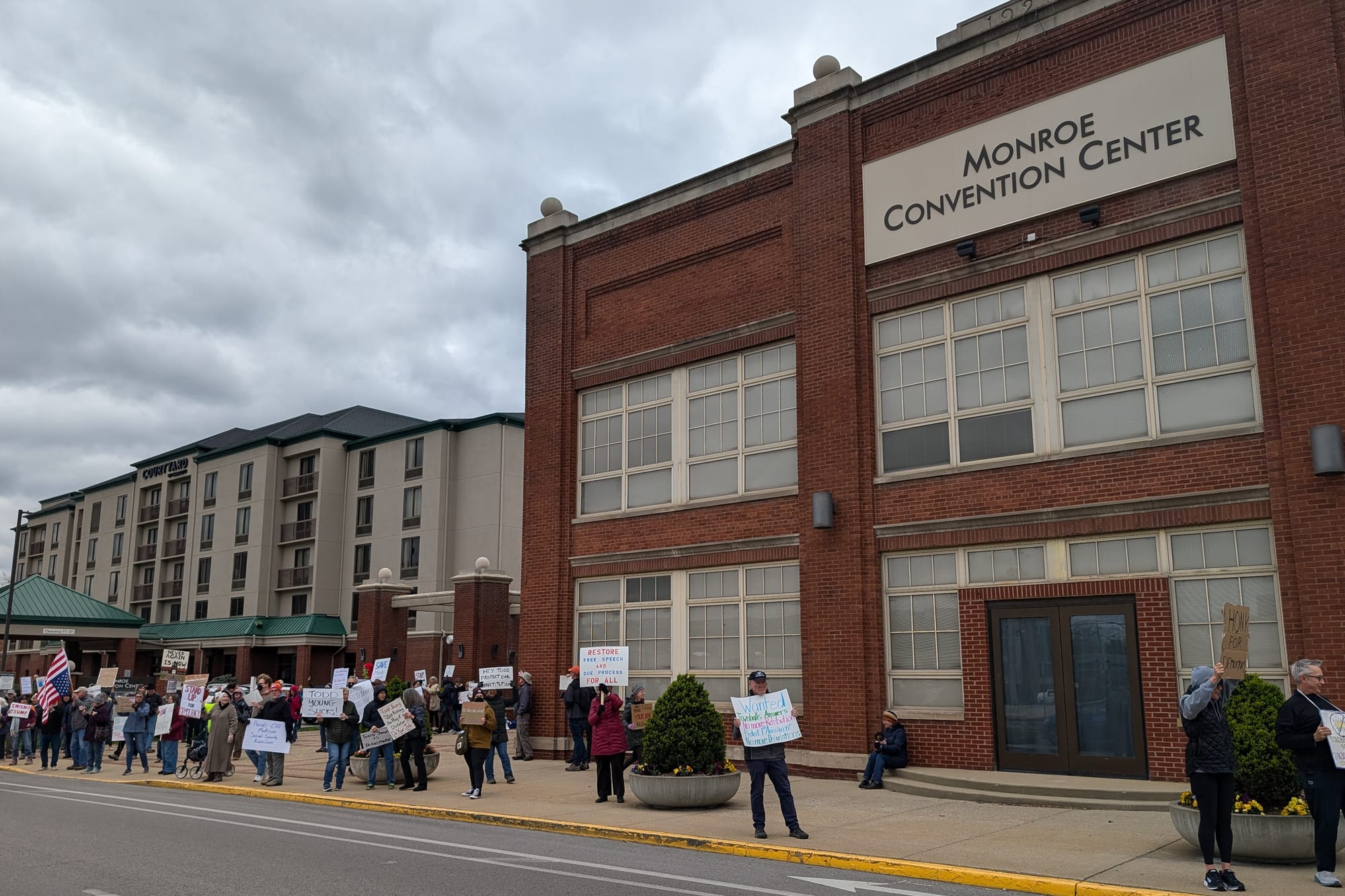 Outside the convention center along College Avenue, demonstrators against Young—for his support of many of the Trump administration's policies—held signs, chanted slogans, and encouraged drivers to honk their horns. The demonstrators started their event at Bloomington's traditional gathering place for protest rallies, at the southeast corner of Monroe County's historic courthouse. The blustery weather conditions sent some signs and headgear flying.