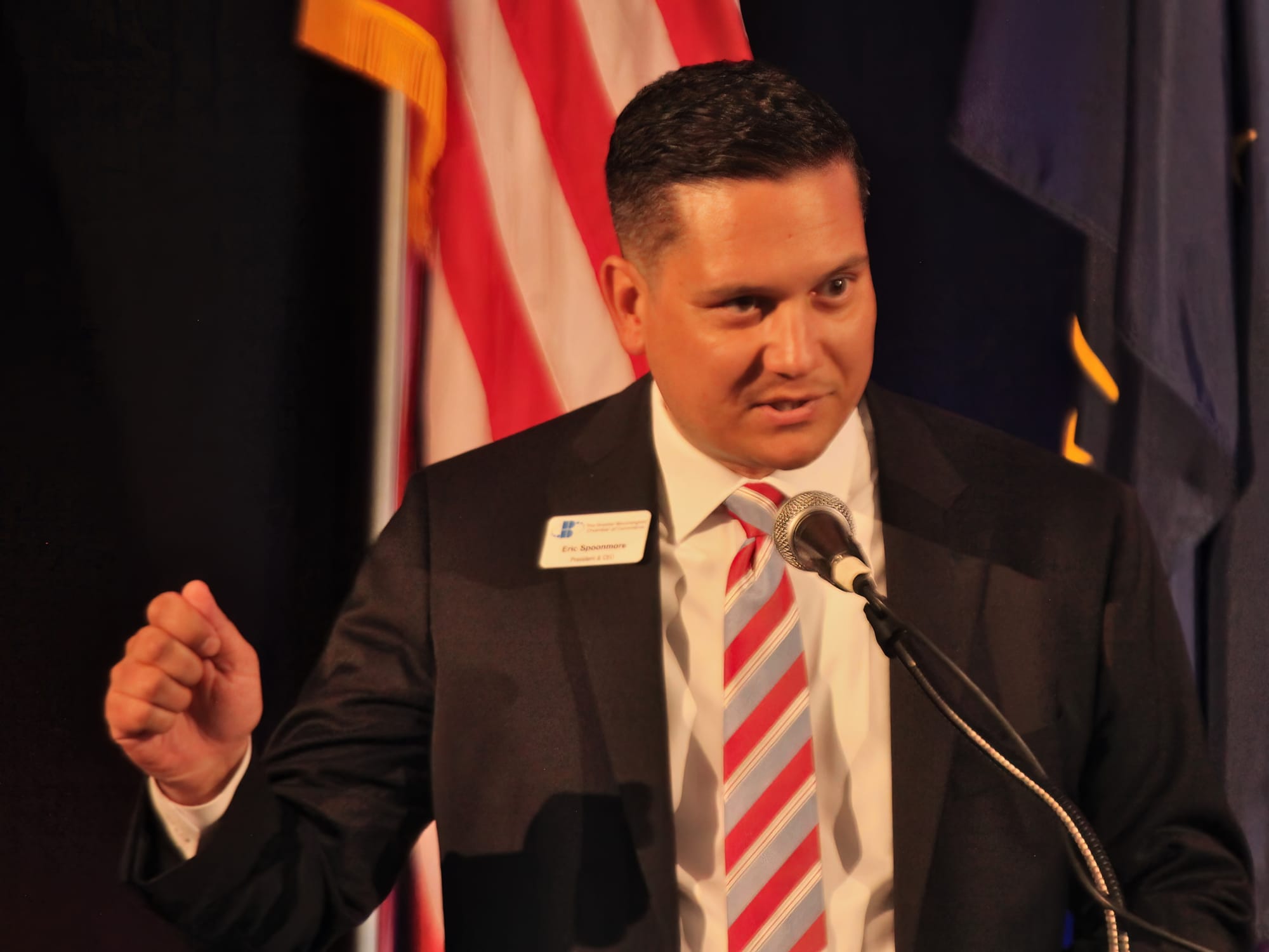 Chamber CEO Eric Spoonmore intervened to tell the woman she could join the other protesters outside if she wanted, but if she wanted to stay, she could not interrupt the senator.