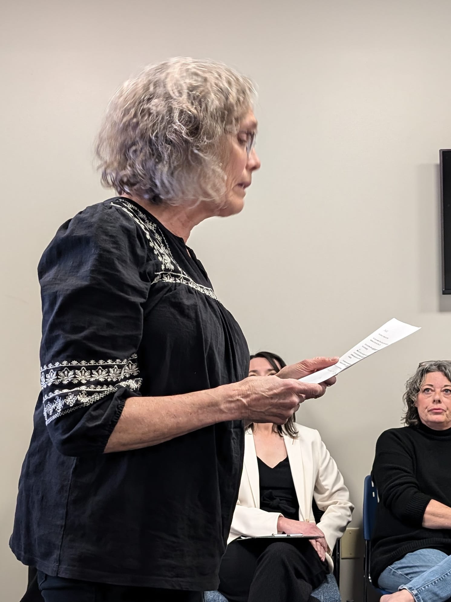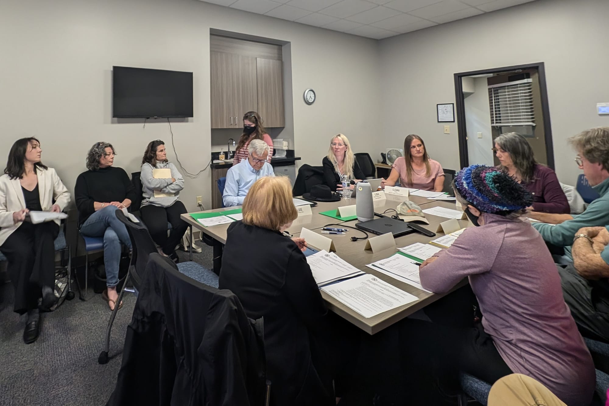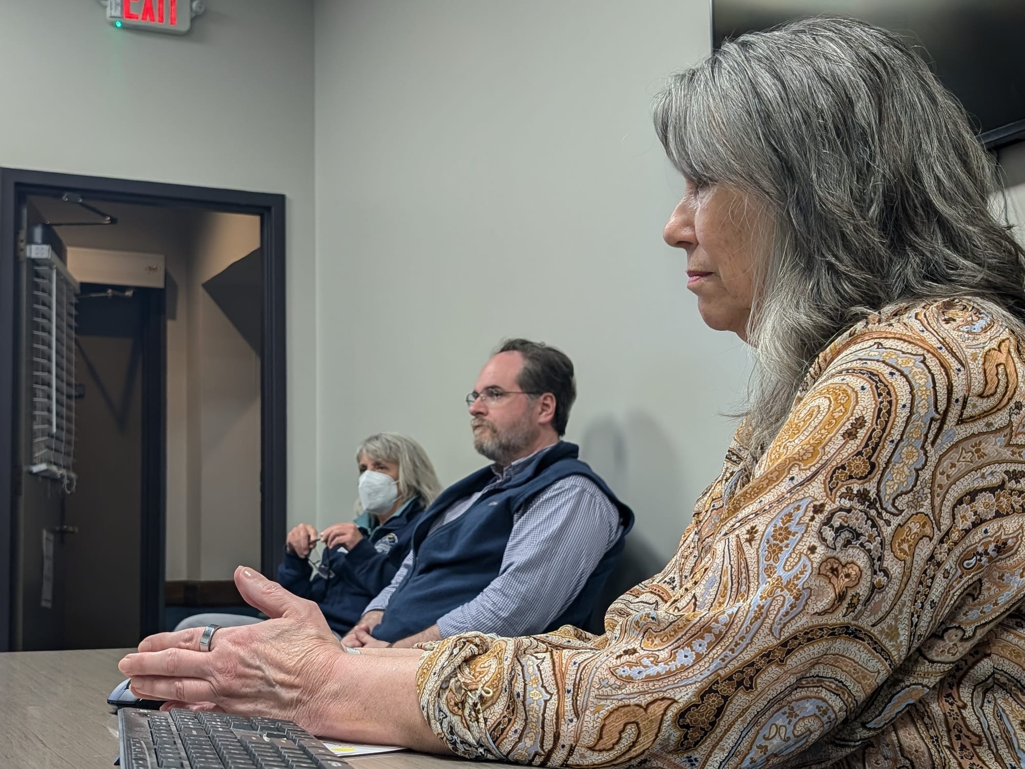 Left: Former Futures Clinic manager Chris Husted. Center: Former Futures Clinic translator Jane Walter. Right: Board of health members sit around the table as public commenters look on. [meeting video] (April 17, 2025)