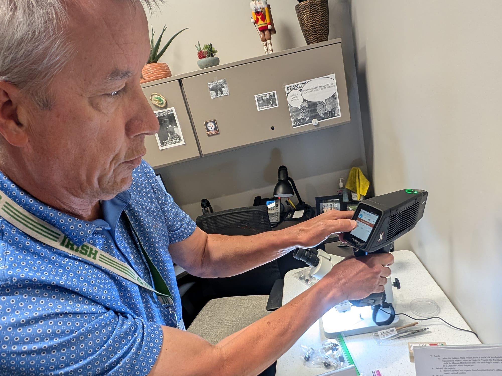 Simeon Baker is an environmental health specialist who demonstrated a lead testing gadget—which uses X-Ray Fluorescence (XRF) to determine the concentration of lead in paint. Baker expressed some frustration that people are reluctant to test their homes for lead, even though the Monroe County health department offers the service for free.