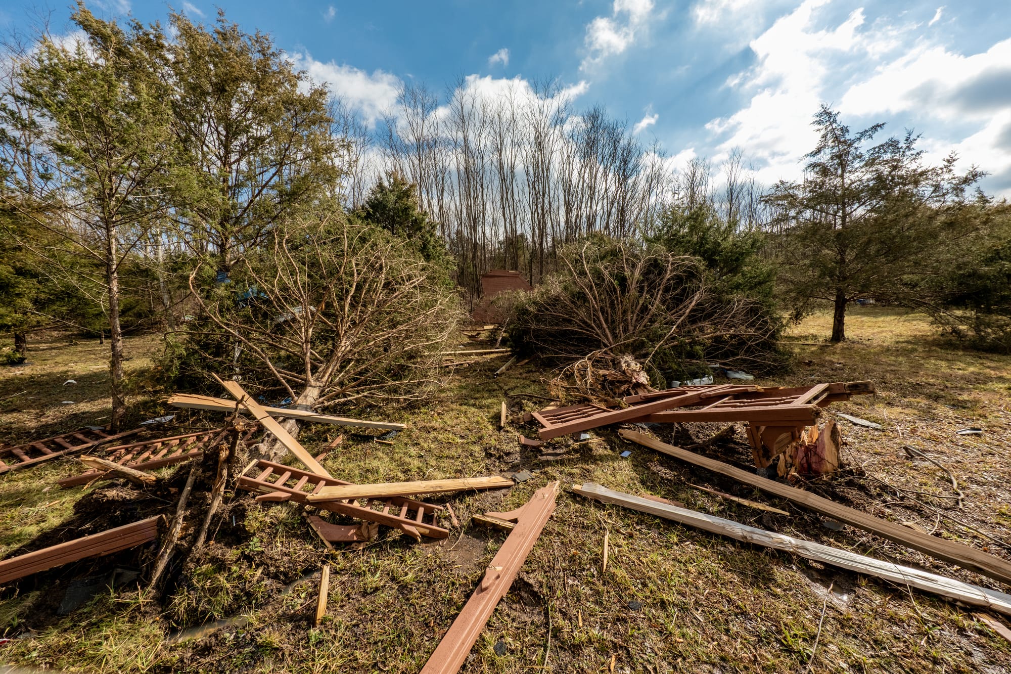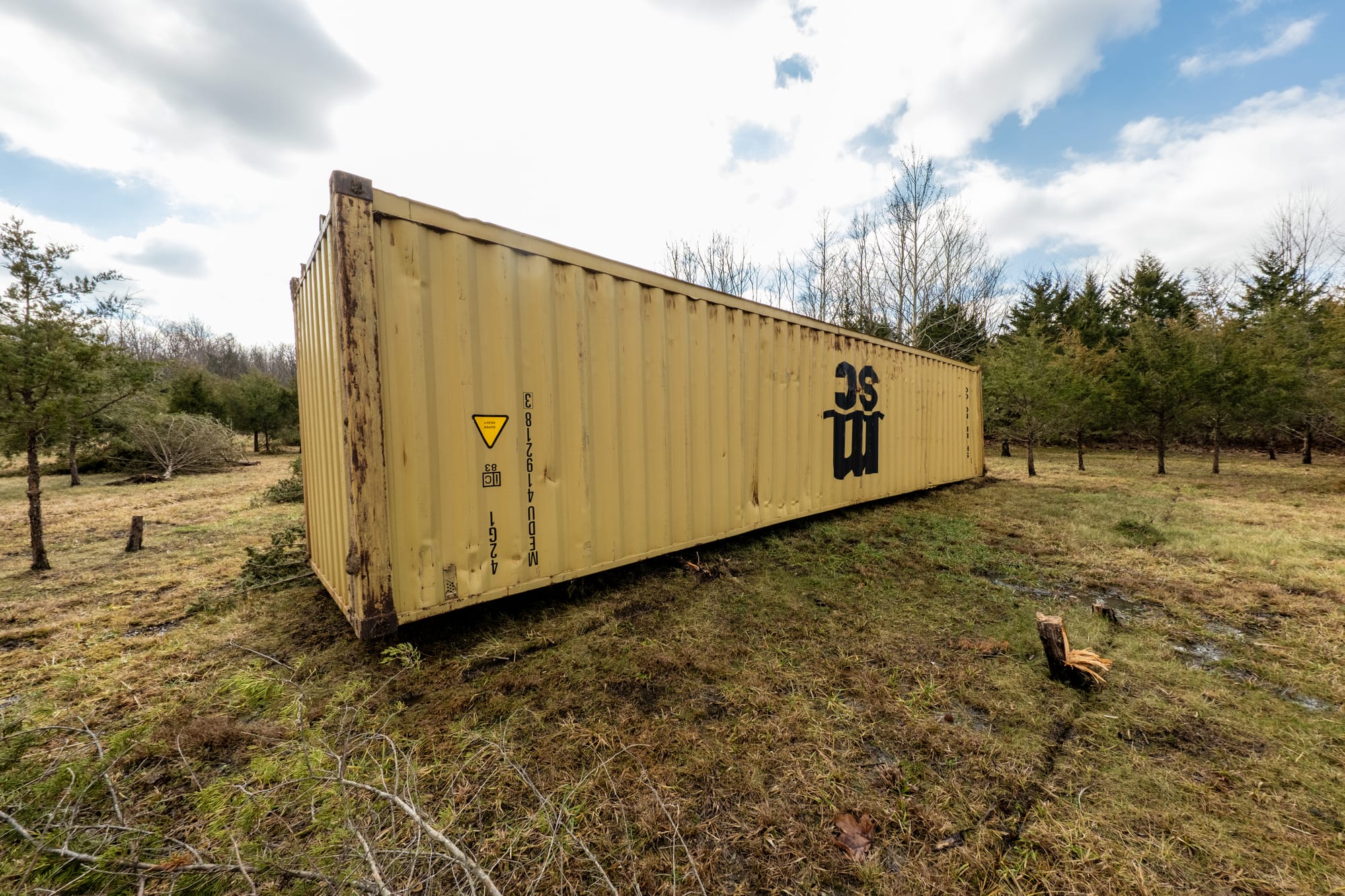 A shipping container on the property was lifted and thrown into a field behind the building. Deep grooves in the ground marked where it tumbled across the grass. Trees, fencing around a dog run, rear landscaping and a backyard shelter were flattened.
