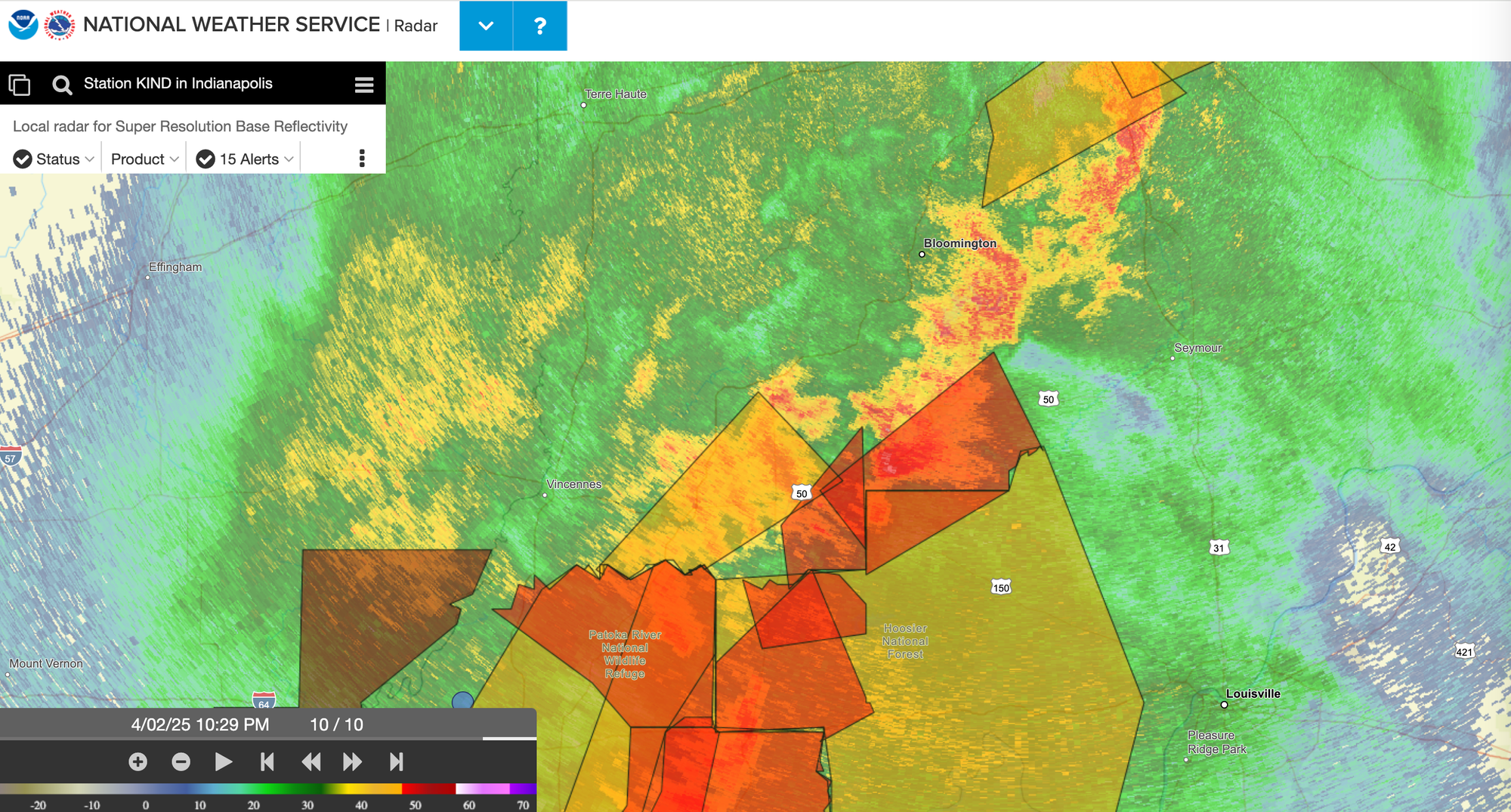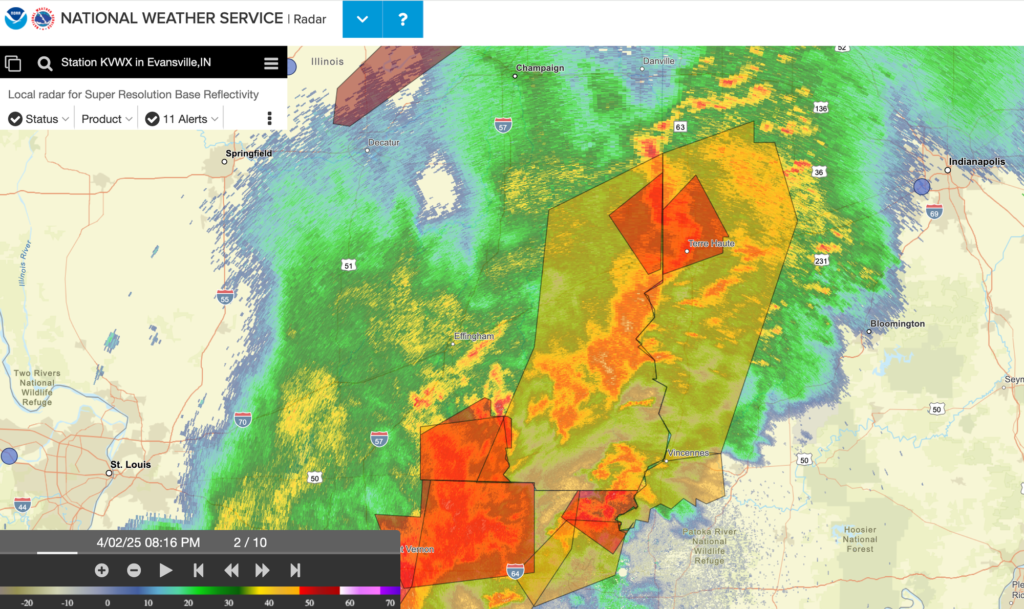 8:36 p.m. Bloomington has so far escaped the worst of the storm as it moves from southwest to northeast, sitting just at the edge of the line of severe weather, according to NWS radar. But based on the size of the angry red patches around Evansville, Bloomington probably will not make it through the night unscathed.