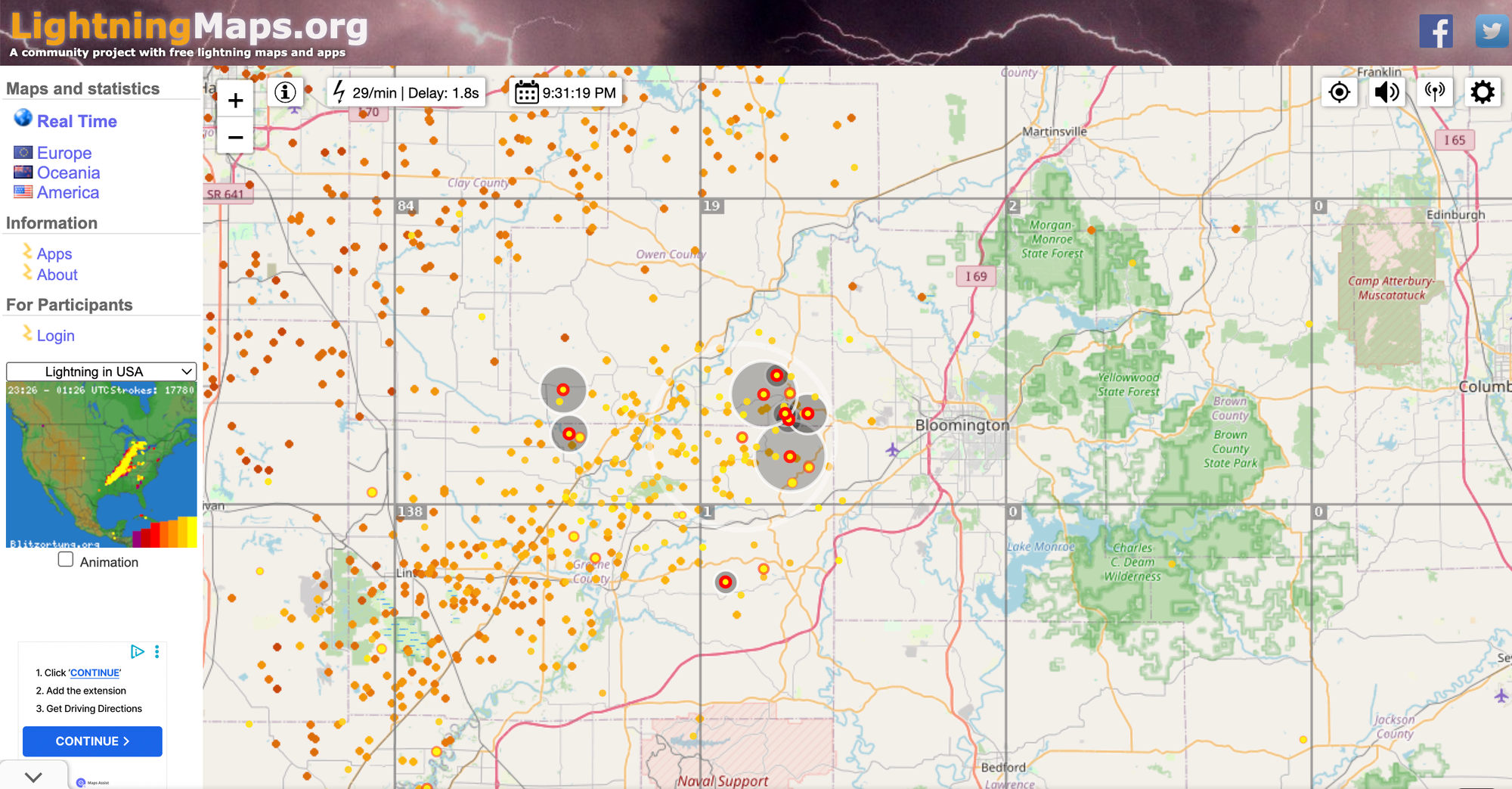 9:31 p.m. LightningMaps.org shows an active cluster of lightning strikes in Greene County. As the cluster moves northeast, it looks like northwest Bloomington and Ellettsville are in a direct path. Thunder clearly audible in downtown Bloomington.