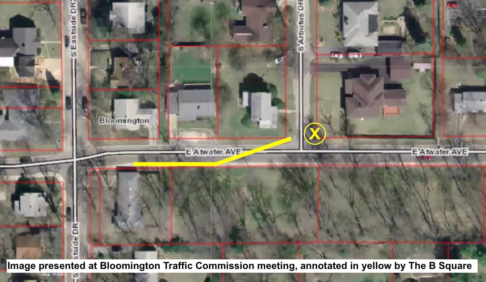 Continuing perfectly straight through the Atwater and Eastside intersection would put a driver up on the right-hand (south) curb of the street.