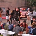 When a driver, described by witnesses as a woman older than 50, piloted her car into the group, one demonstrator was left lying face down in the crosswalk across 6th Street, on the east side of Walnut. The victim appeared to be conscious when an ambulance transported her from the scene.