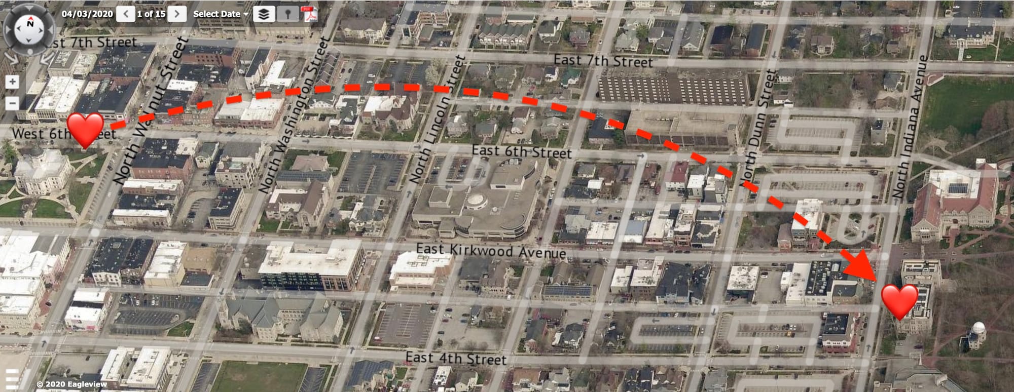 Acting on a hunch that the bird’s flight plan included a landing at the Bryan Hall nest, at 4th Street and Indiana Avenue, The B Square headed to campus. The B Square was able to see the pair adding the new twig to the nest, then post up in a nearby tree east of the building.
