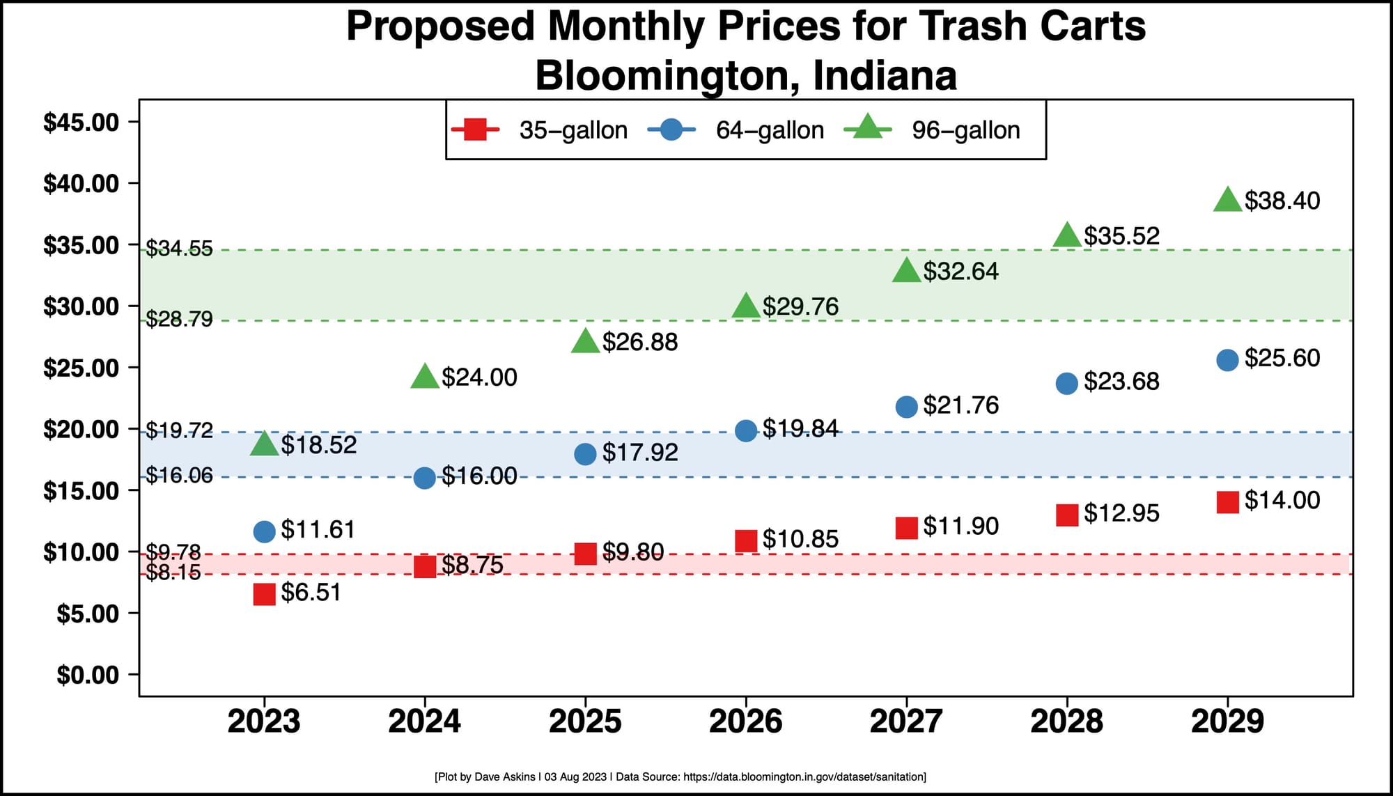 The increase three years ago was relatively incremental. The 35-gallon cart size, which is the smallest option, increased from $6.22 to $6.51 per month, which is 4.6 percent more. That put the cost at the top of the range that is currently spelled out in city code.