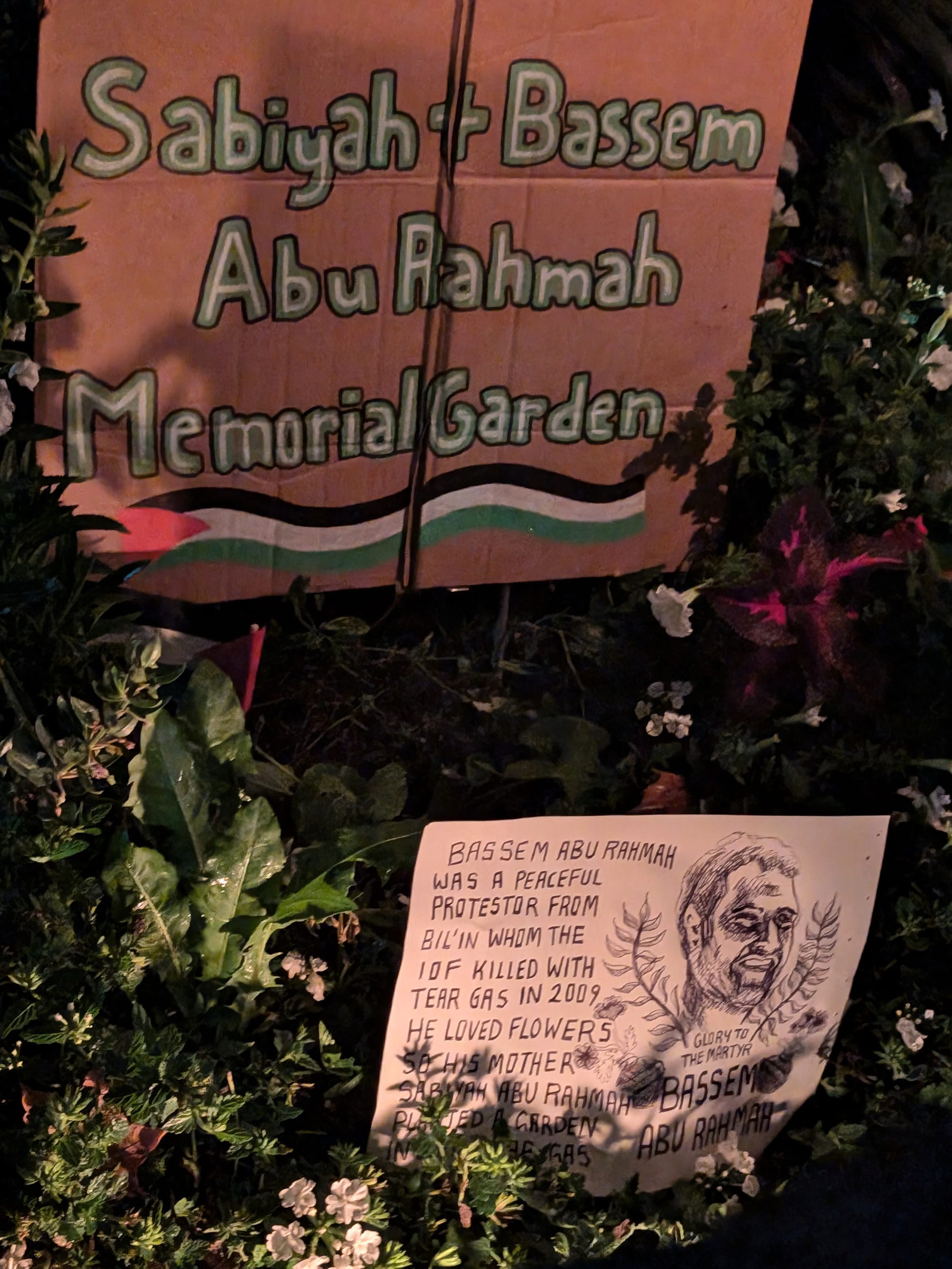 She described the garden she’d helped plant, subsequently torn out by a university backhoe, as a tribute to Sabiyah and Bassem Abu Rahman. She described how Israeli soldiers had been firing tear gas canisters at protesters in the West Bank when Bassem had tried to convince them to stop. Instead they aimed a canister at his chest, killing him, she said.