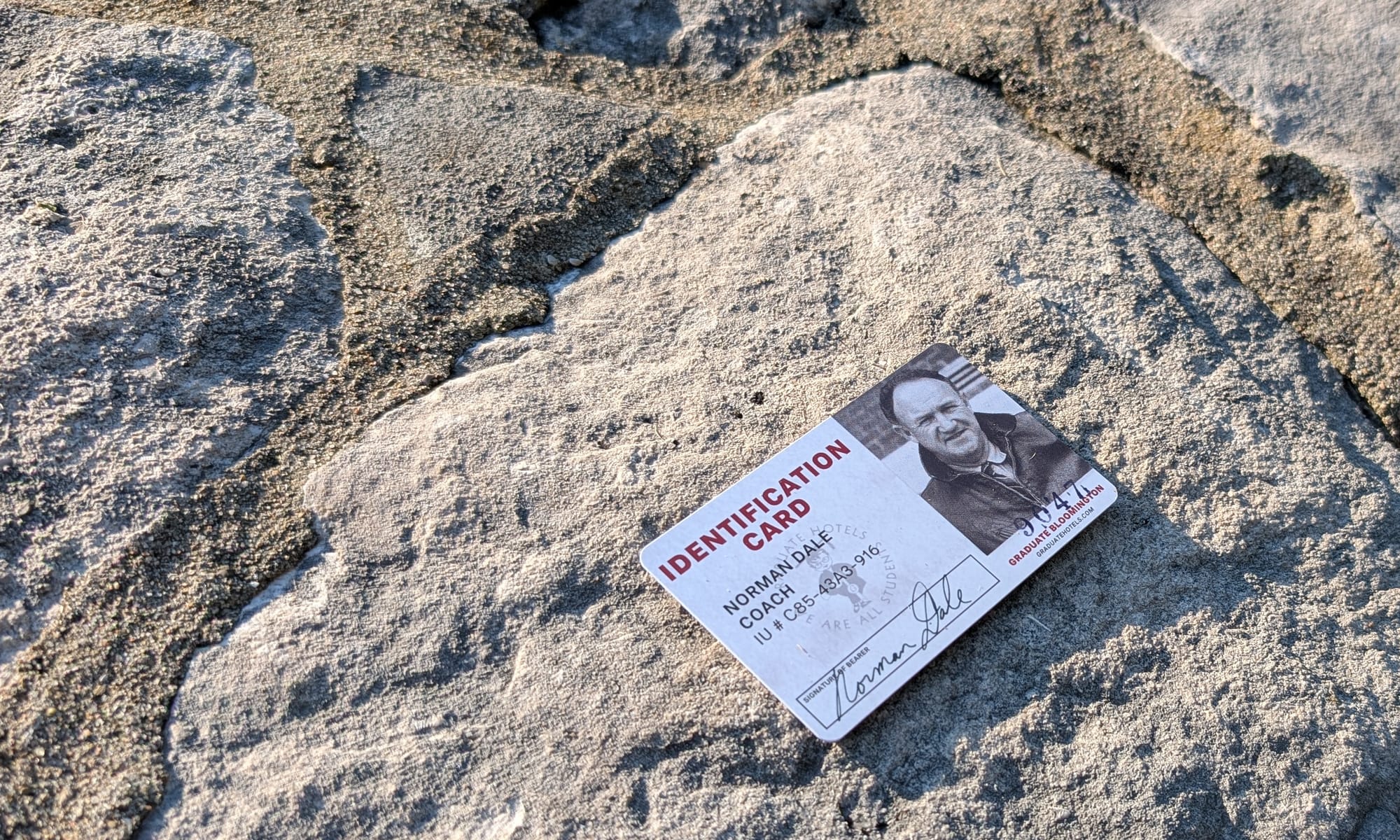 This ID card was sitting on the rock wall where I think someone probably left it so that the owner could find it easily. I did not disturb it. Coach Dale said,“My team’s on the floor” but his ID card is on the rock wall. (Dave Askins, July 11, 2025)