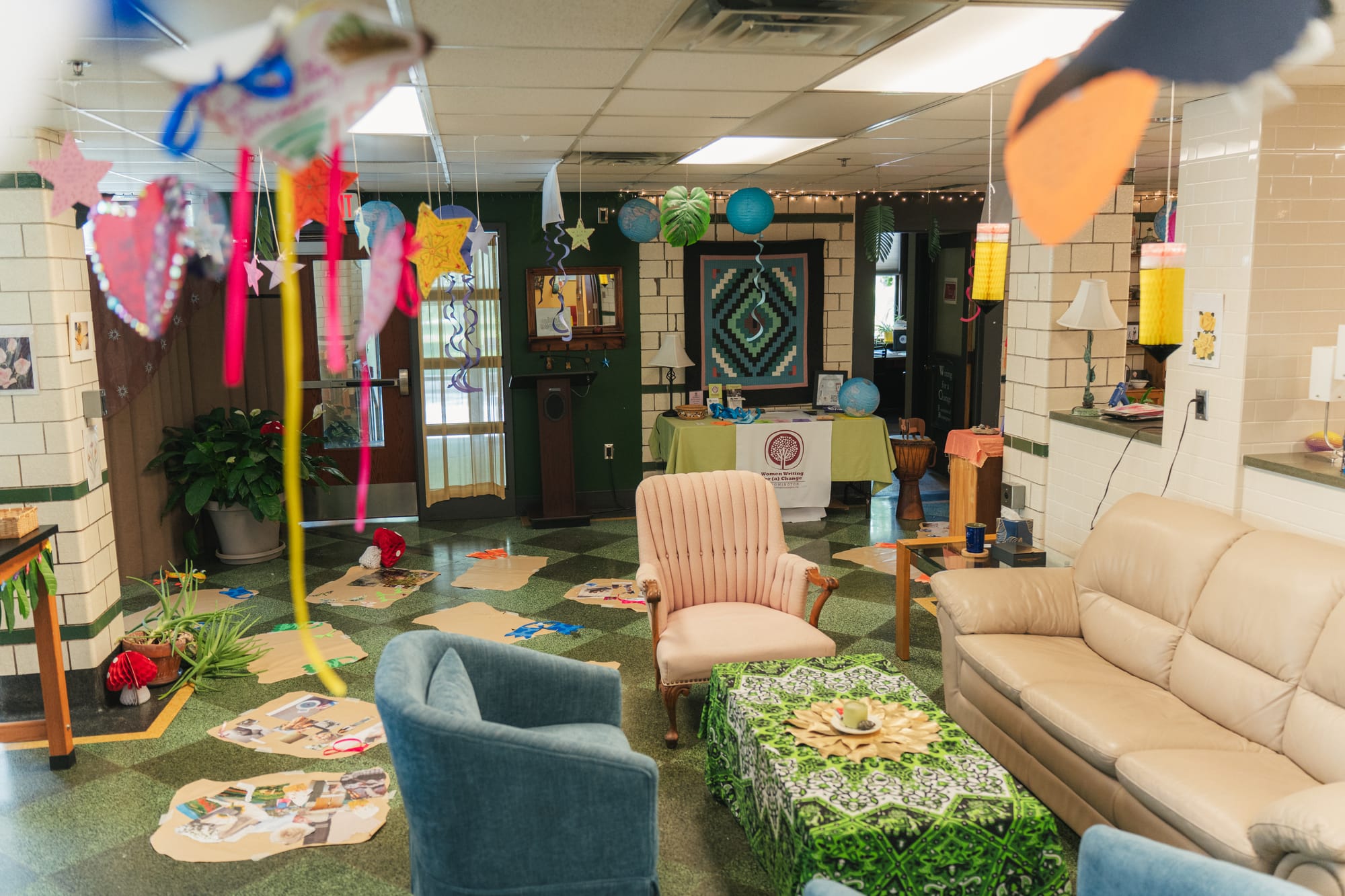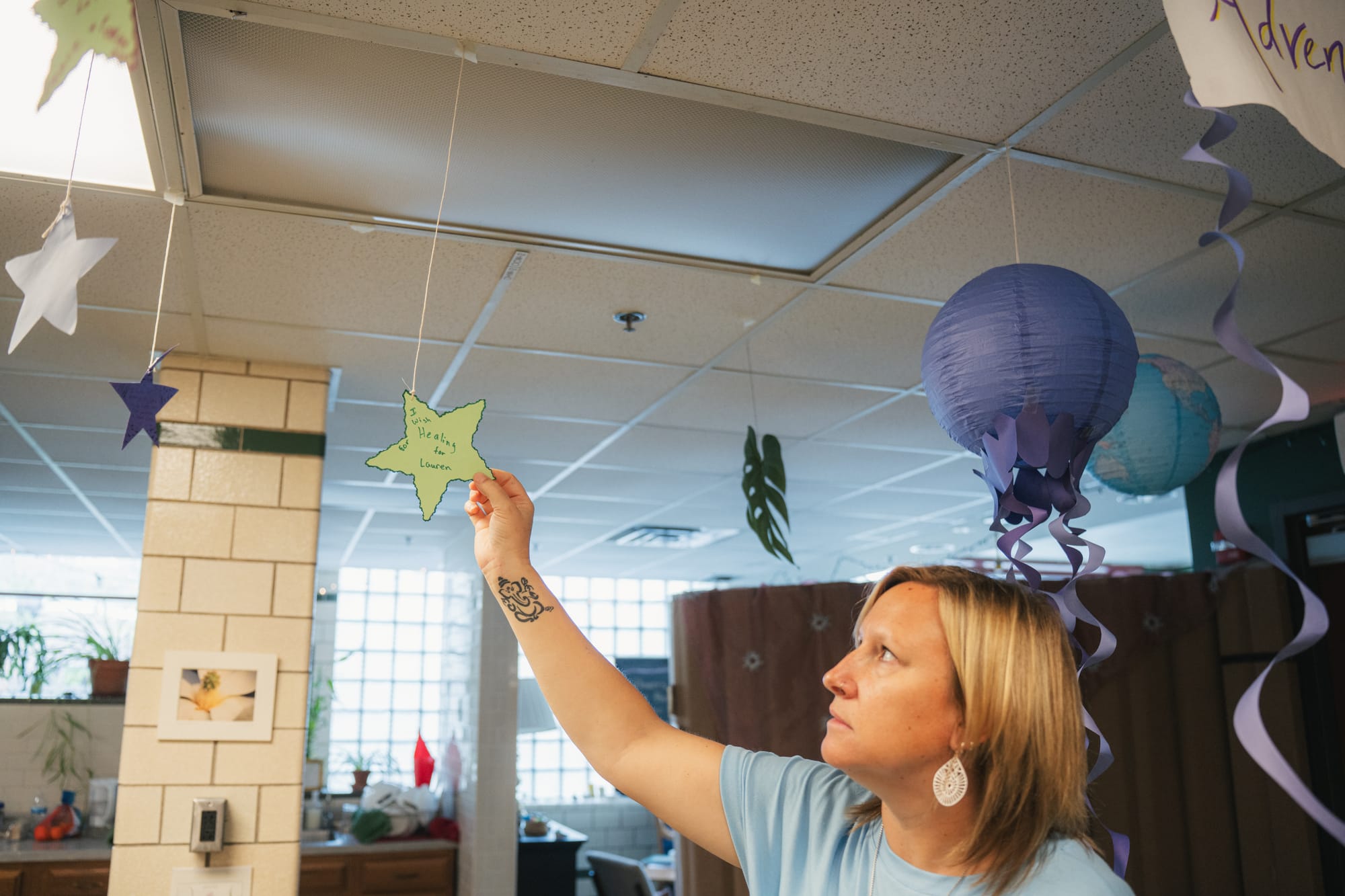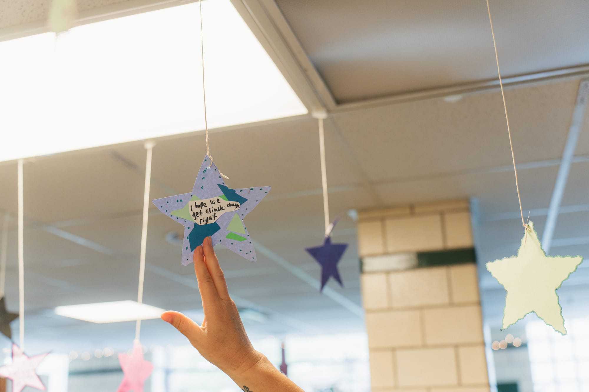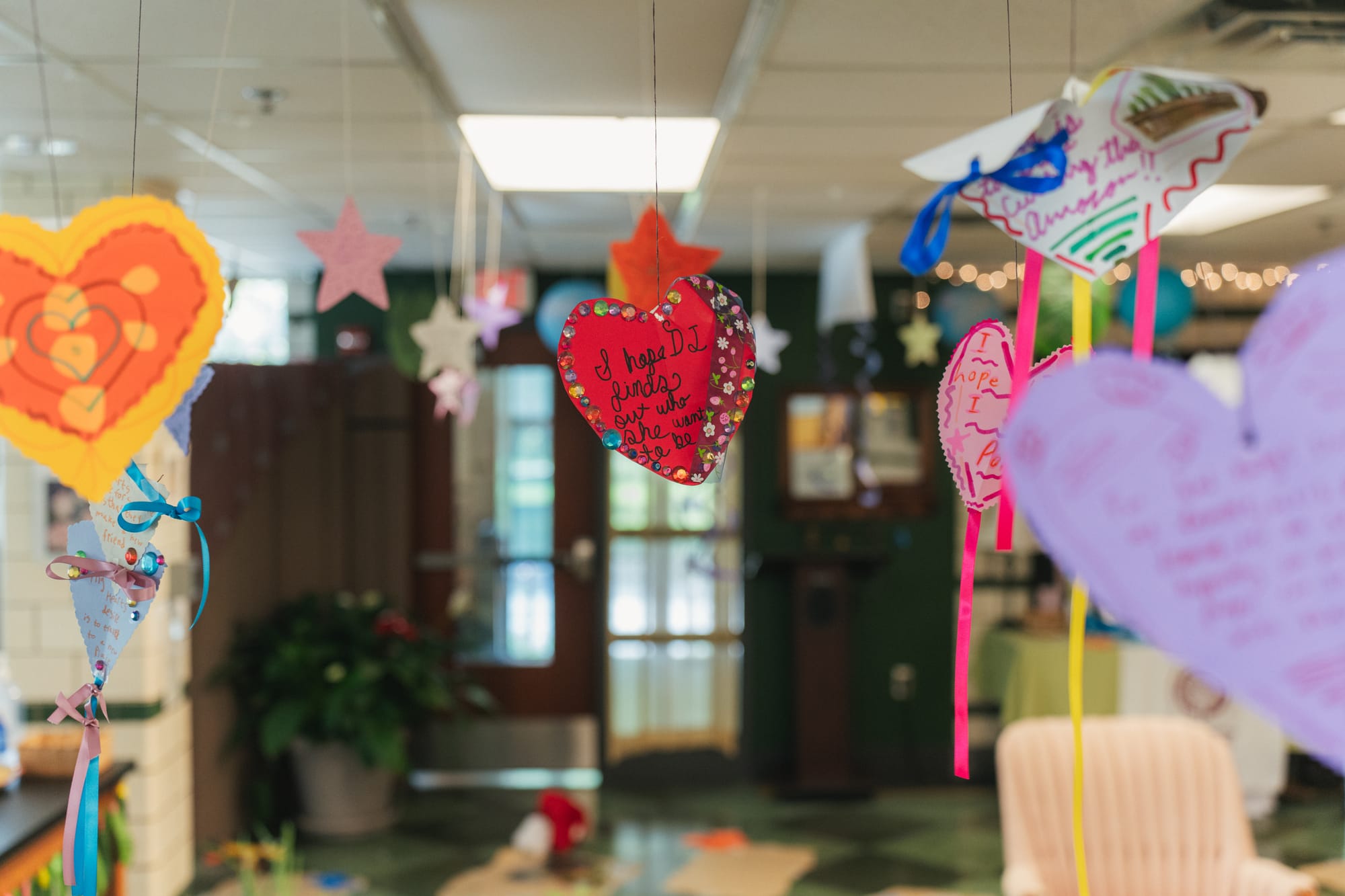 The camp space at the Women Writing for (a) Change youth summer camp is decorated with work from the campers. The stars are “wishes for yourself or someone else,” and the hearts represent “your heart’s desire.” (Kelton O'Connell, July 10, 2025)